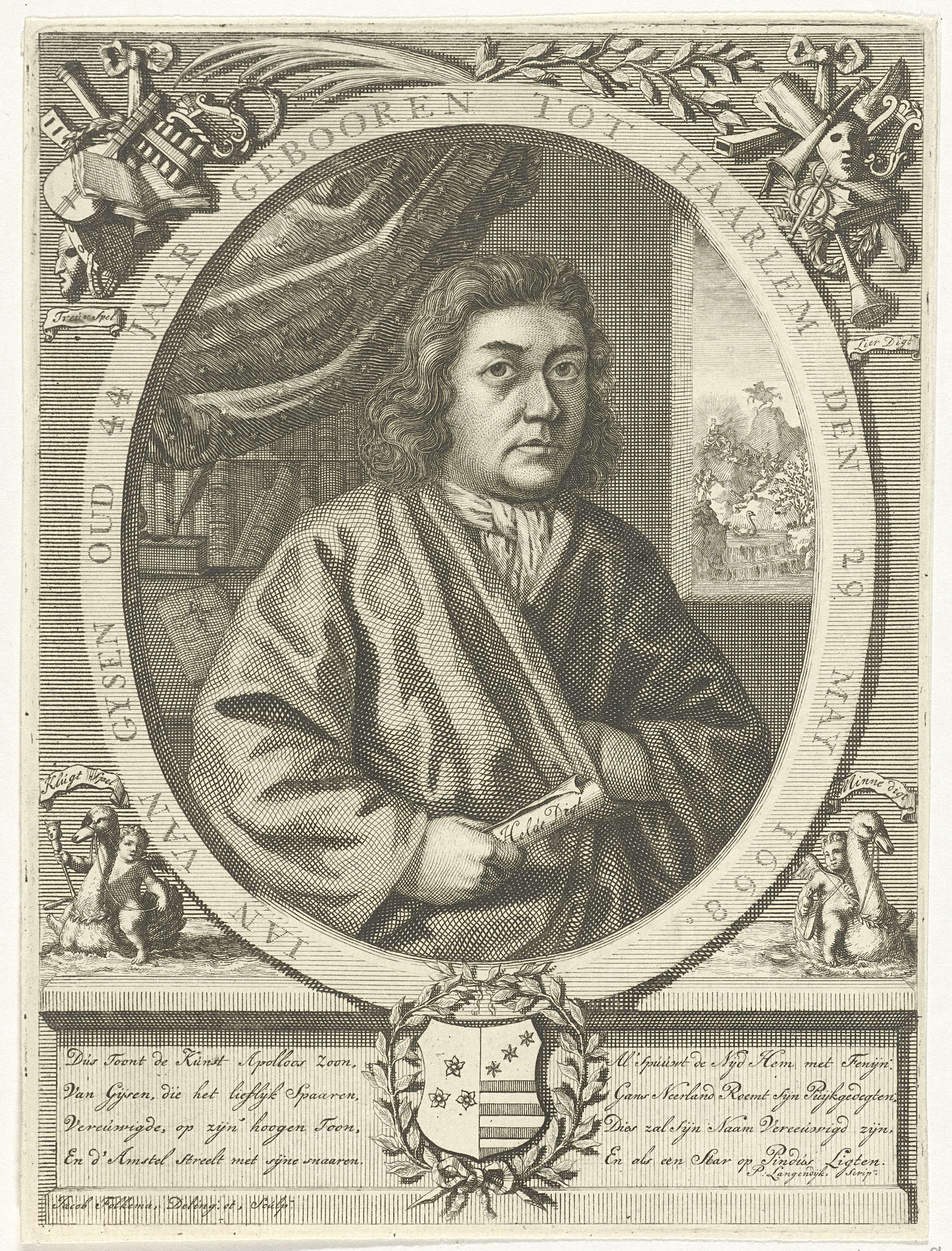 Portret ten halven lijve naar rechts van dichter Jan van Gijsen, blootshoofds. In zijn hand houdt Gijsen een rol papier vast waarop "Helde Digt" staat geschreven. Om het ovaal staat een randschrift, onder het portret is op een sokkel een wapenschild afgebeeld met links en rechts hiervan een tekst in het Nederlands. In de bovenhoeken ...