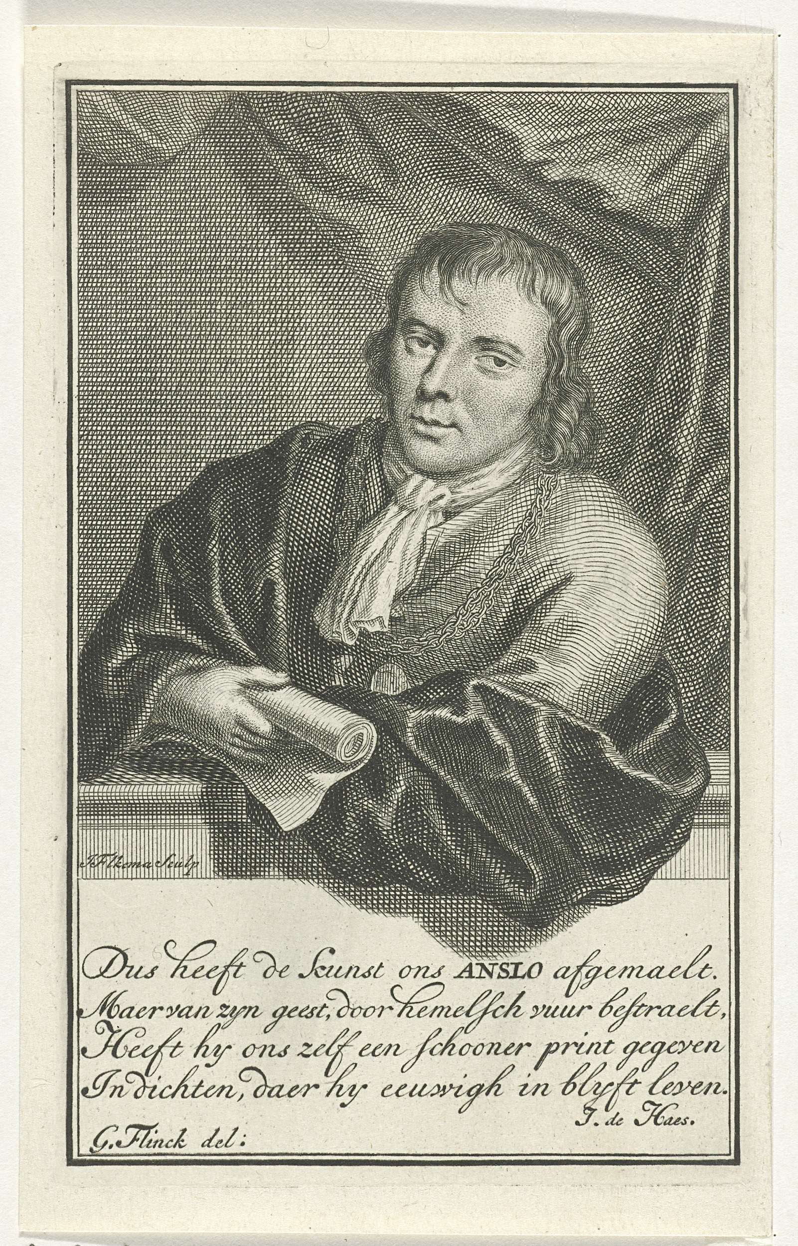Portret ten halven lijve naar links van de letterkundige Reyer Anslo, blootshoofds. In zijn hand houdt Anslo een rol papier. Onder het portret staat een vierregelige tekst in het Nederlands. Op versozijde een tekst in boekdruk.
