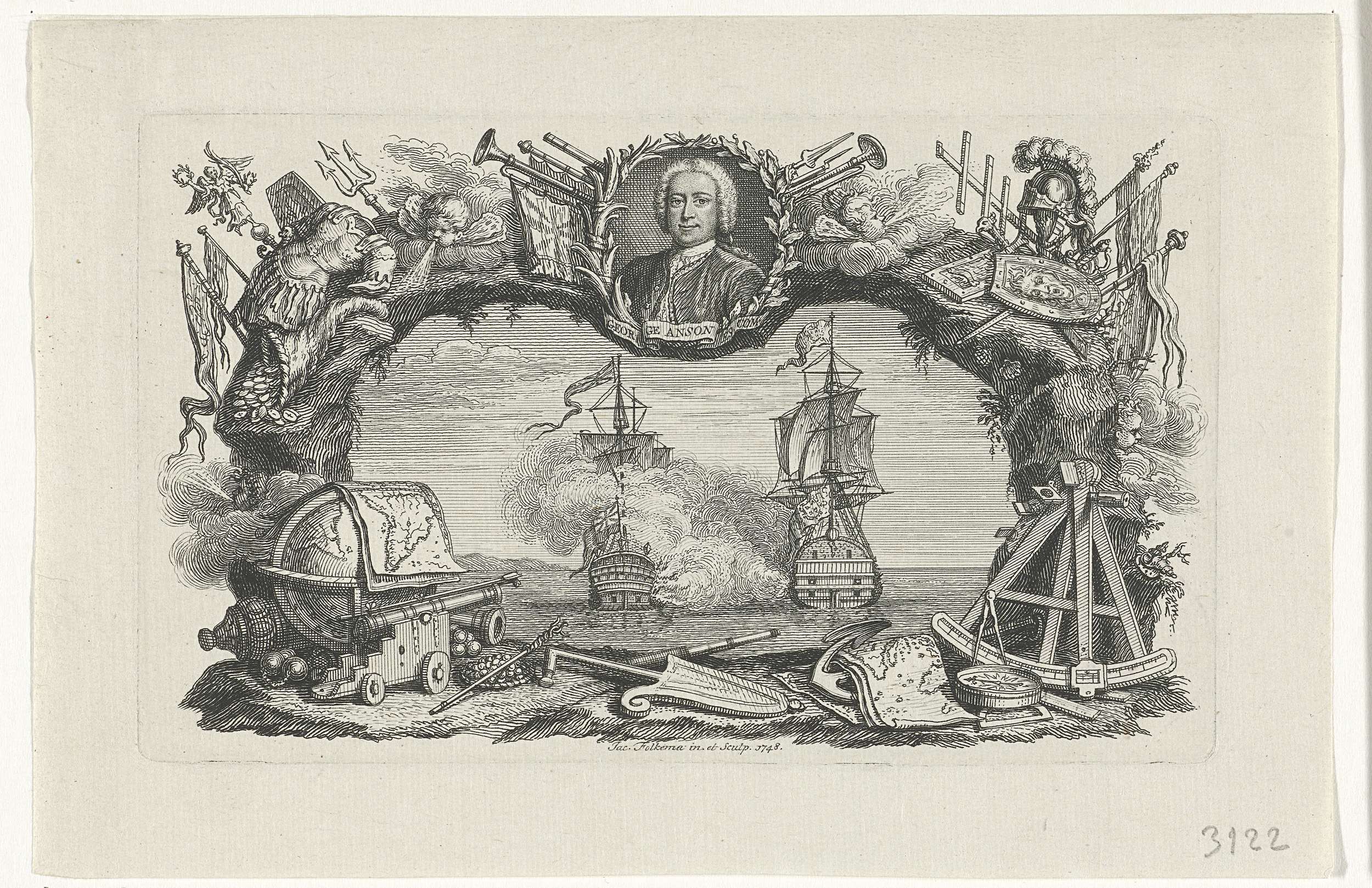 Zeeslag, omgeven door een rijk gedecoreerde lijst waarin bovenaan een portretbuste in ovaal naar links van de Engelse admiraal George Anson prijkt. Op de voorgrond staat links een wereldbol naast een kanon, rechts meetinstrumenten en een landkaart.