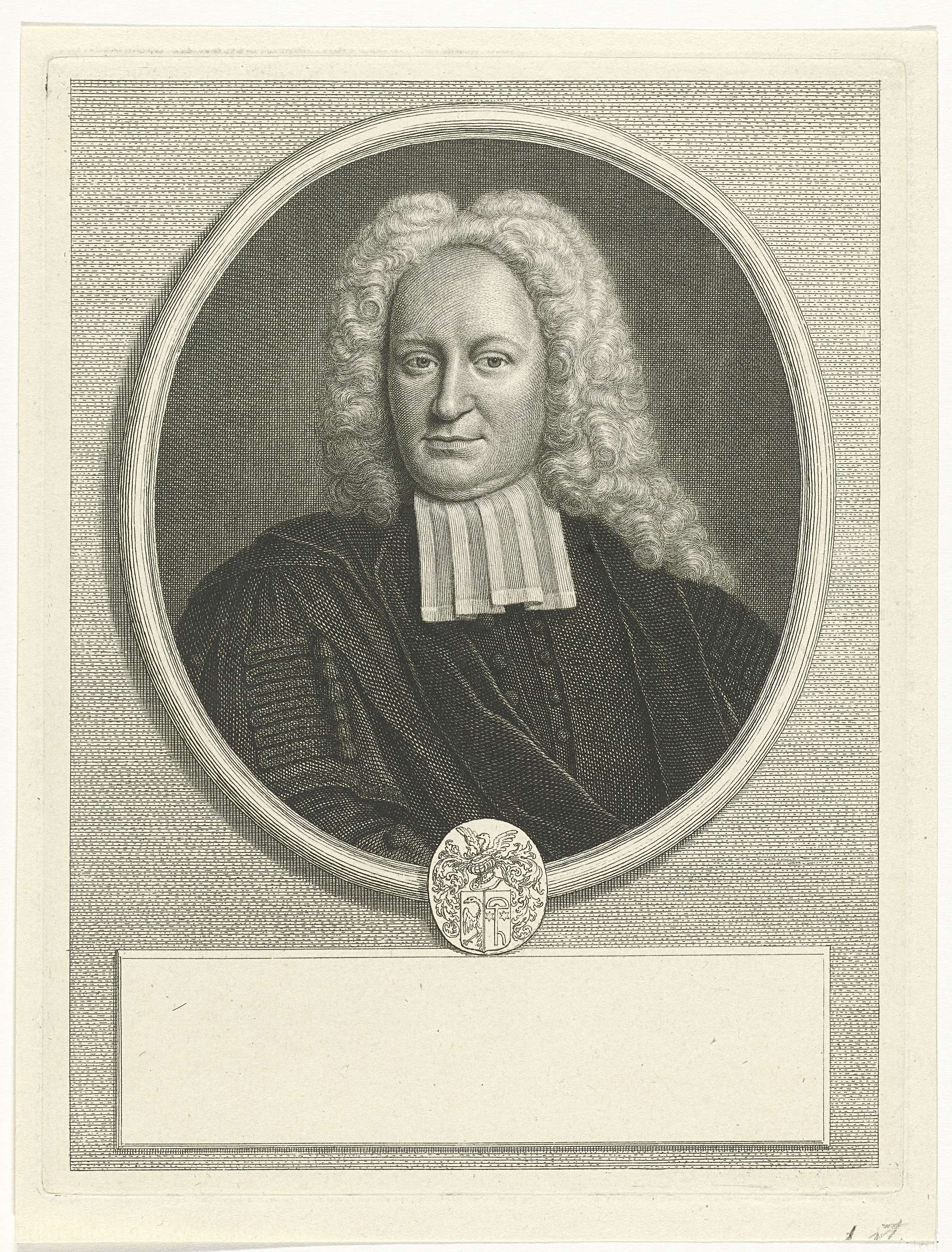 Portretbuste in ovaal naar rechts van hoogleraar en predikant Johannes Ens, blootshoofds en gehuld in een toga. Onderin de ovale lijst prijkt zijn wapenschild.