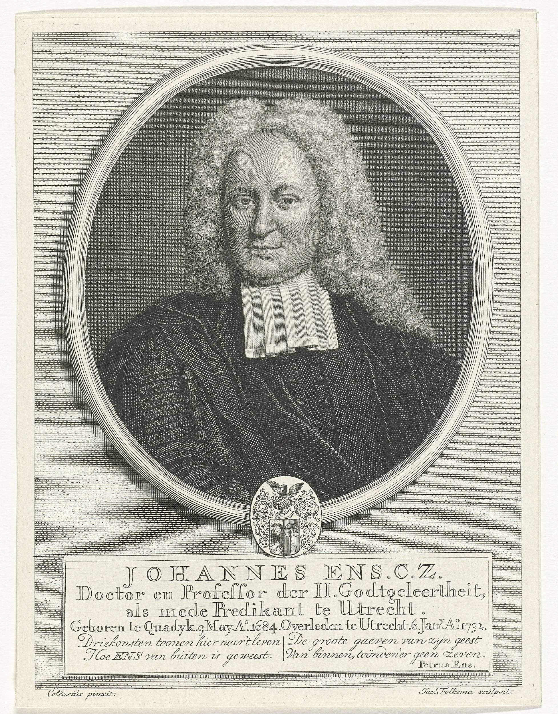Portretbuste in ovaal naar rechts van hoogleraar en predikant Johannes Ens, blootshoofds en gehuld in een toga. Onderin de ovale lijst prijkt zijn wapenschild, onder het portret staan de naam, titels, geboorte- en sterfgegevens van de geportretteerde, gevolgd door een tweeregelige tekst in het Nederlands.