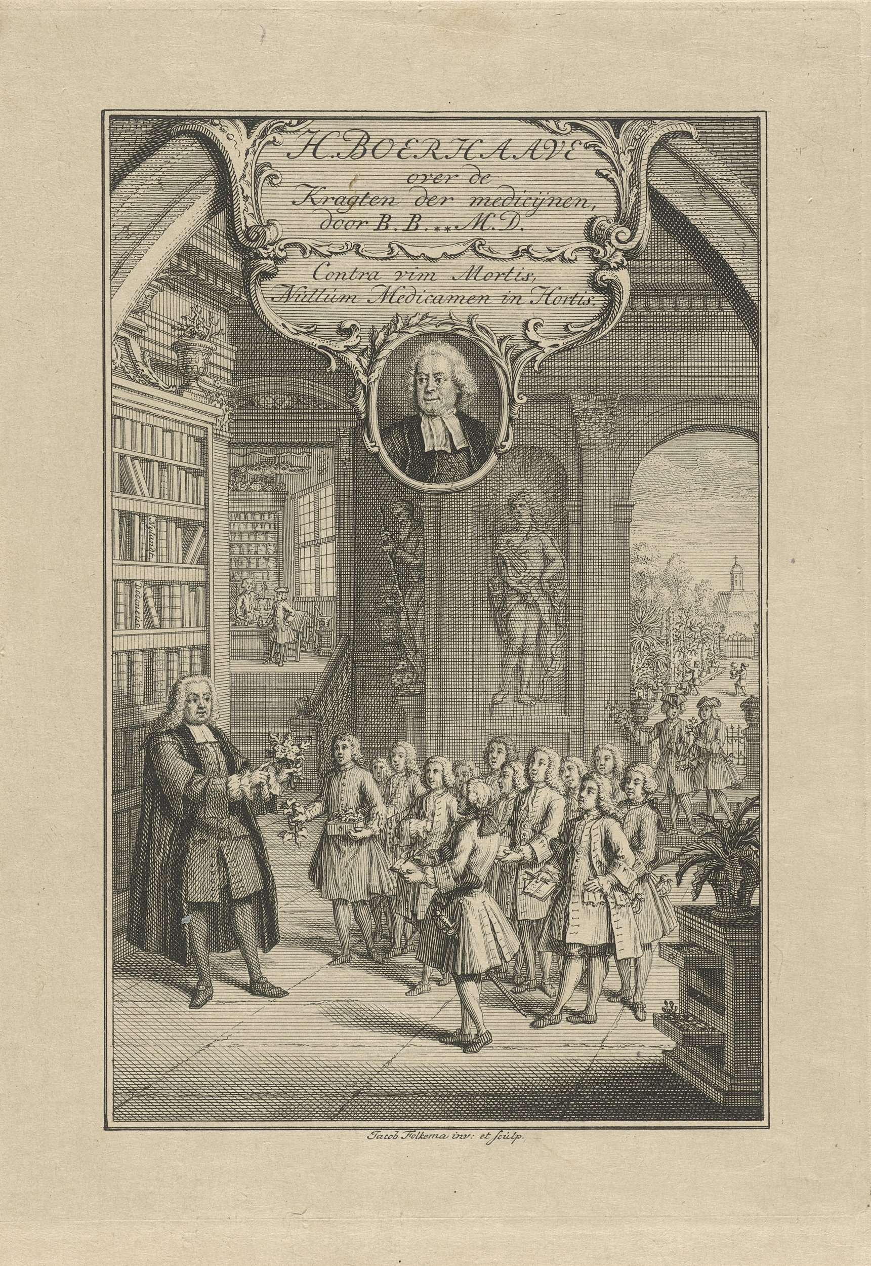 Hermanus Boerhaave onderwijst een groep leerlingen over de medicinale kracht van kruiden. Achter zijn rug een boekenwand. In een nis in de ruimte staat een beeld van Apollo. Rechts, door een grote boog, is een botanische tuin te zien. Boven deze voorstelling een auteursportret.