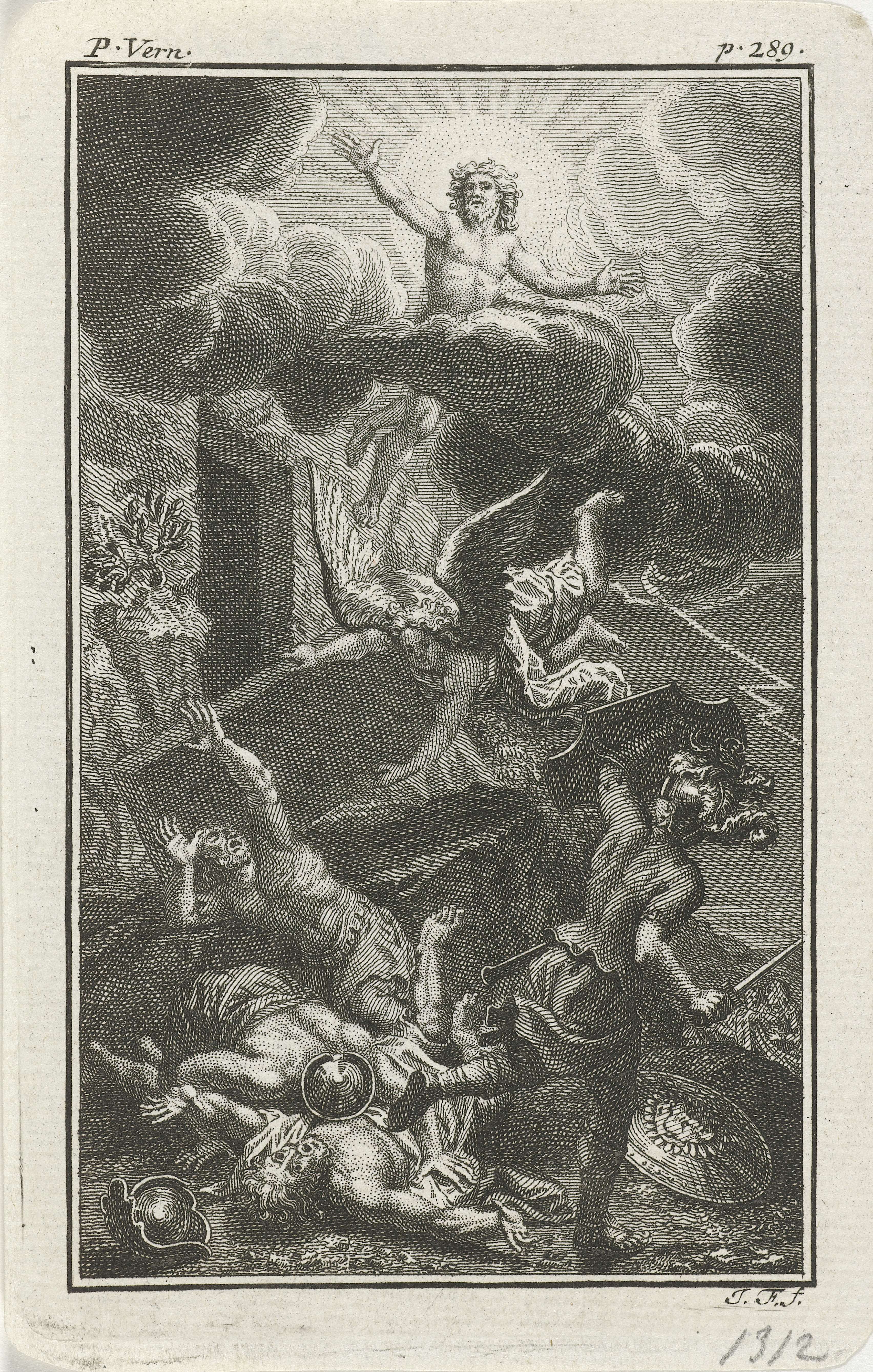 Christus is opgestaan uit zijn graf, onder hem vliegt een engel met de grafsteen. Een aantal uit hun slaap ontwaakte bewakers kijkt verschrikt omhoog, anderen beschermen hun ogen tegen de verblindende aura die Christus omringt.