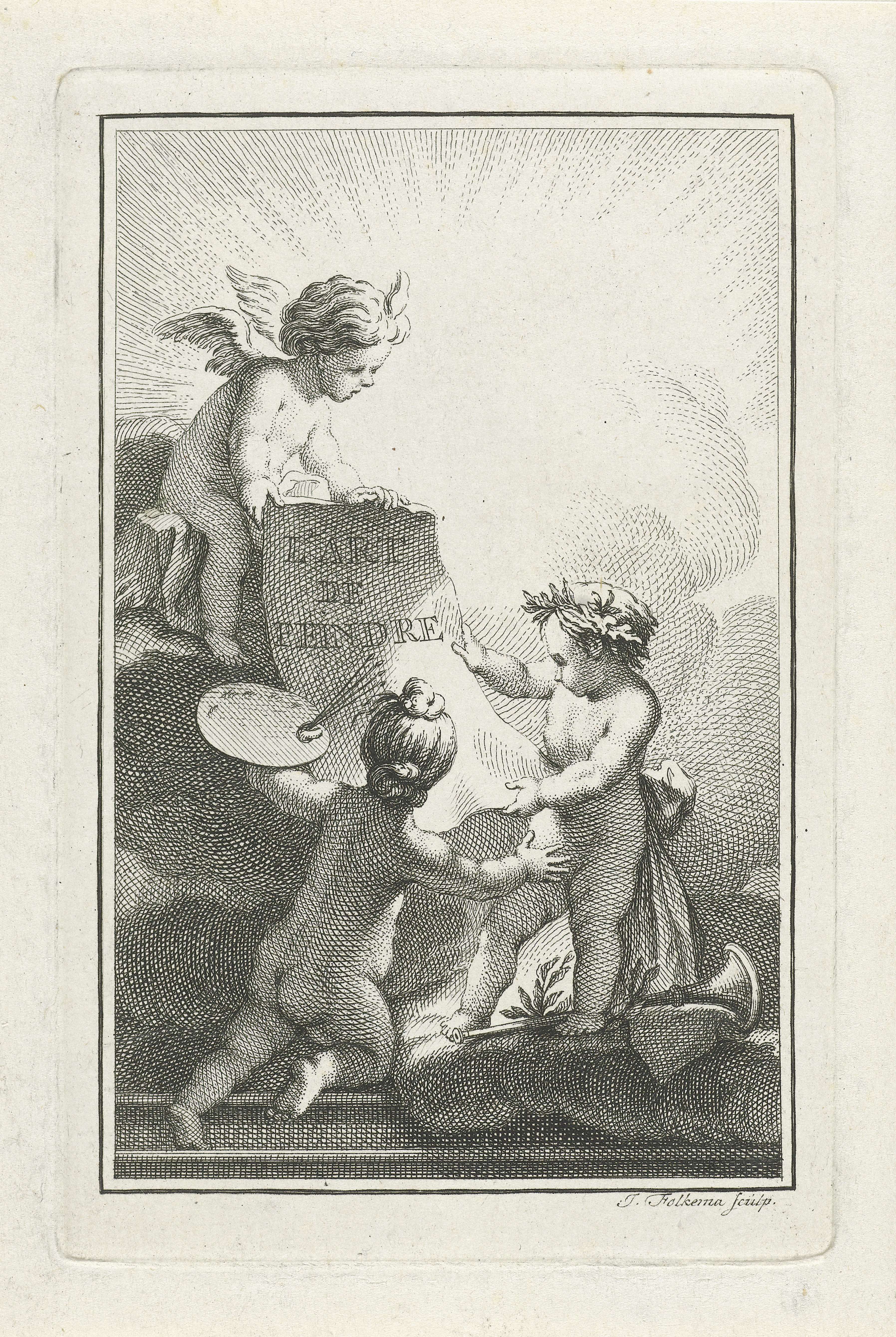 Twee putti bestuderen een vel papier met de tekst: L'Art de Peindre. De linker putto houdt een schilderspalet vast, de rechter is gelauwerd en staat op een bazuin die op de grond ligt. Op een wolk hierboven kijkt een engeltje met een vlam boven het het hoofd, symbool van goddelijke inspiratie, mee.