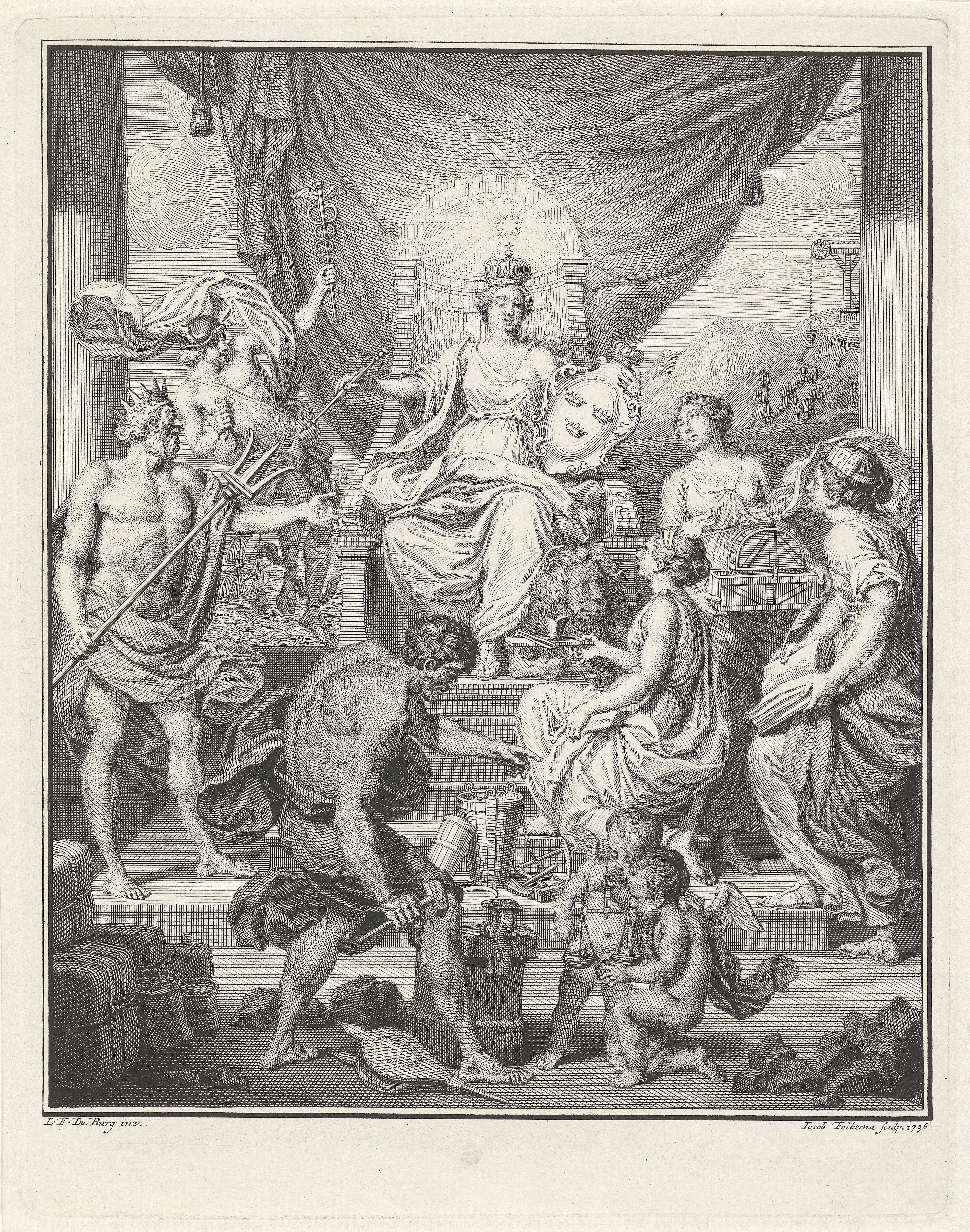 De personificatie van de Republiek der Nederlanden zit op een troon, in haar handen een scepter en een wapenschild met de beeltenis van drie kronen. Rond de troon staan links Mercurius en Neptunus en rechts personificaties die de tronende Republiek geschenken willen aanbieden. Op de voorgrond staan een smid met een hamer bij een aambeeld ...
