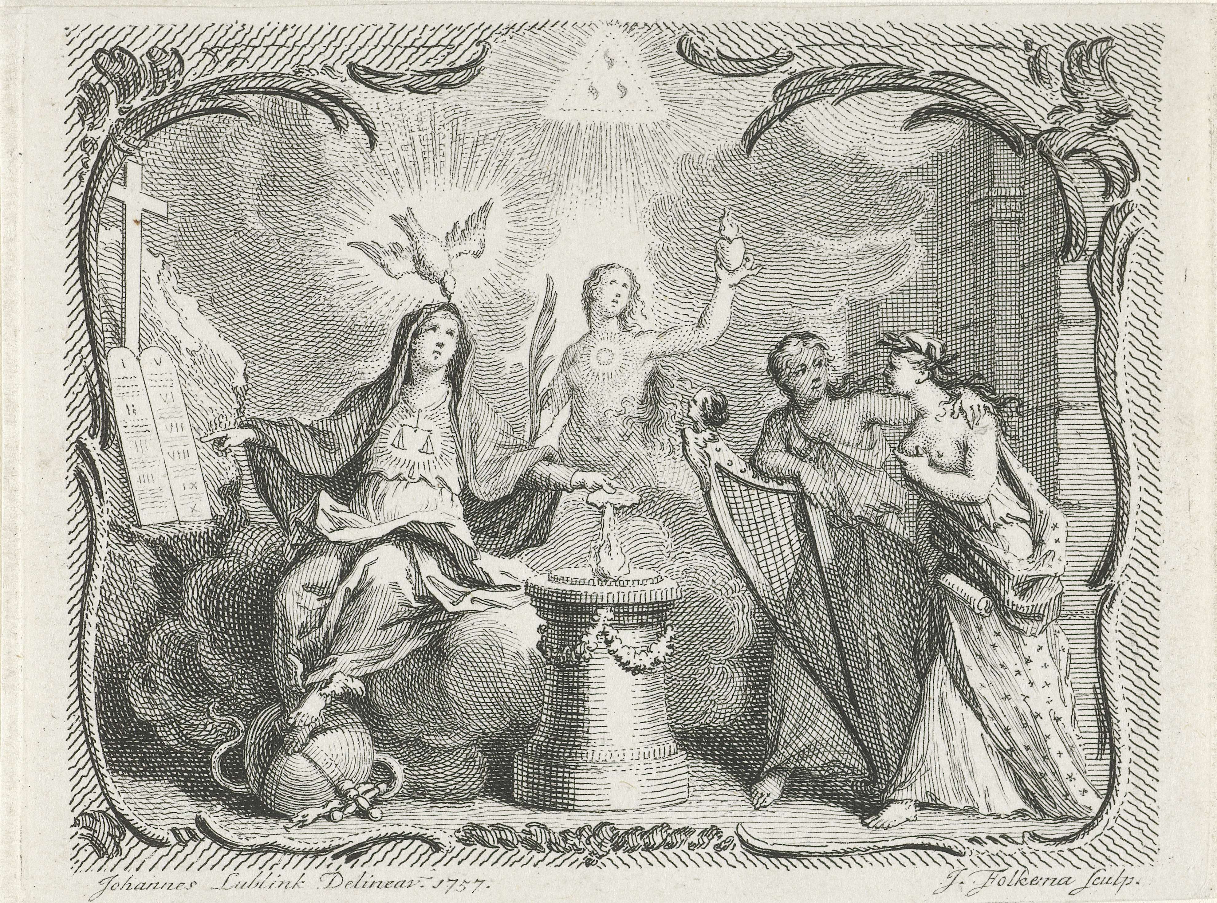 Bij een offerzuil zit het Geloof, een van de drie theologische deugden, en wijst op de twee tabletten met de tien geboden naast haar. Boven haar hoofd vliegt de Heilige Geest in de vorm van een duif. Rechts staan twee allegorische figuren, één met harp en de ander gehuld in een sterrenkleed. Op de achtergrond ...