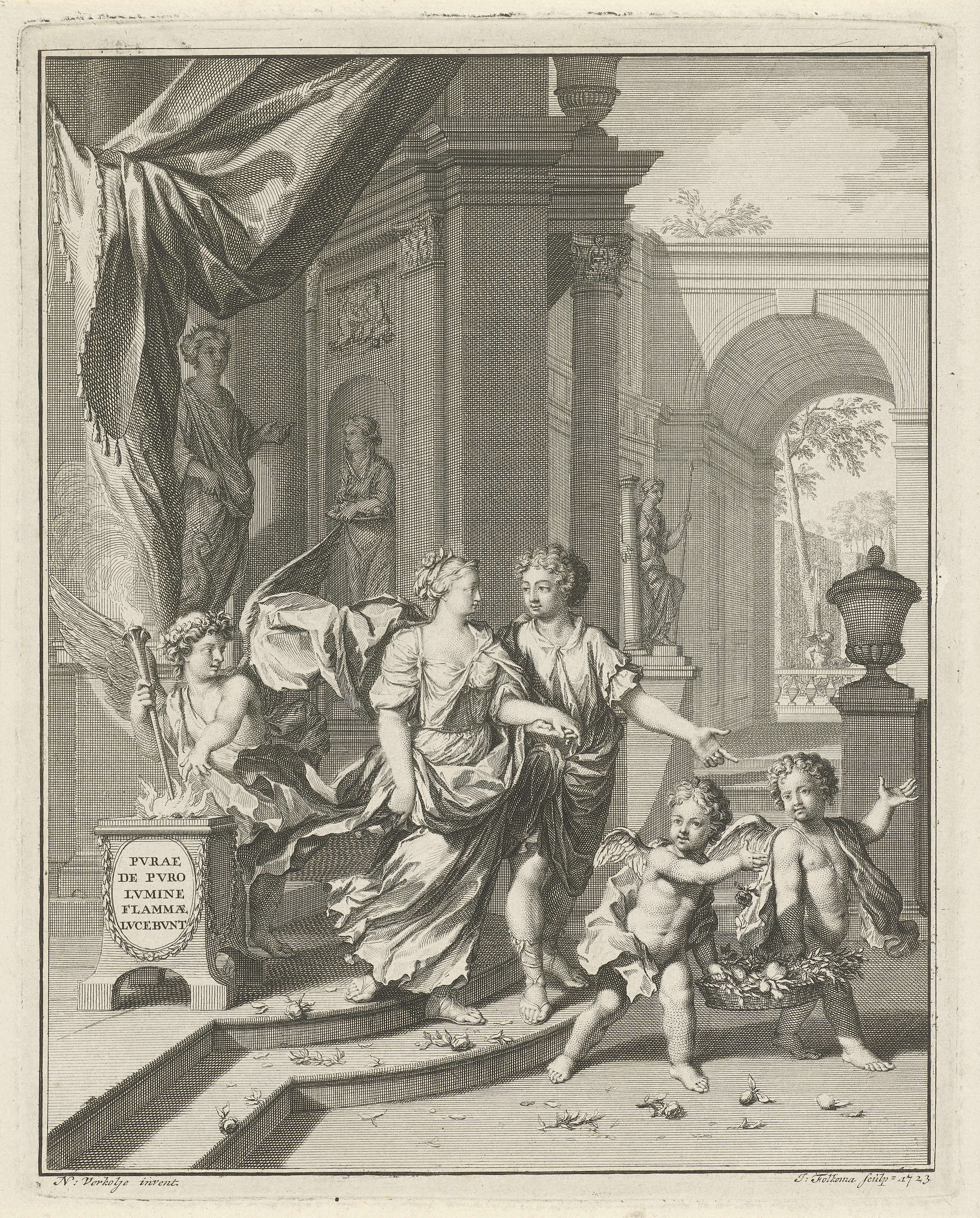Een liefdespaar loopt hand in hand een tempel uit en wordt nagekeken door Juno, waakster over huwelijk en geboorte. Twee putti lopen voor het paar uit en strooien bloemen. Links staat een engel met een toorts bij een offerzuil waarop de tekst "Purae de Puro Lumine Flammae Lucebunt" staat.