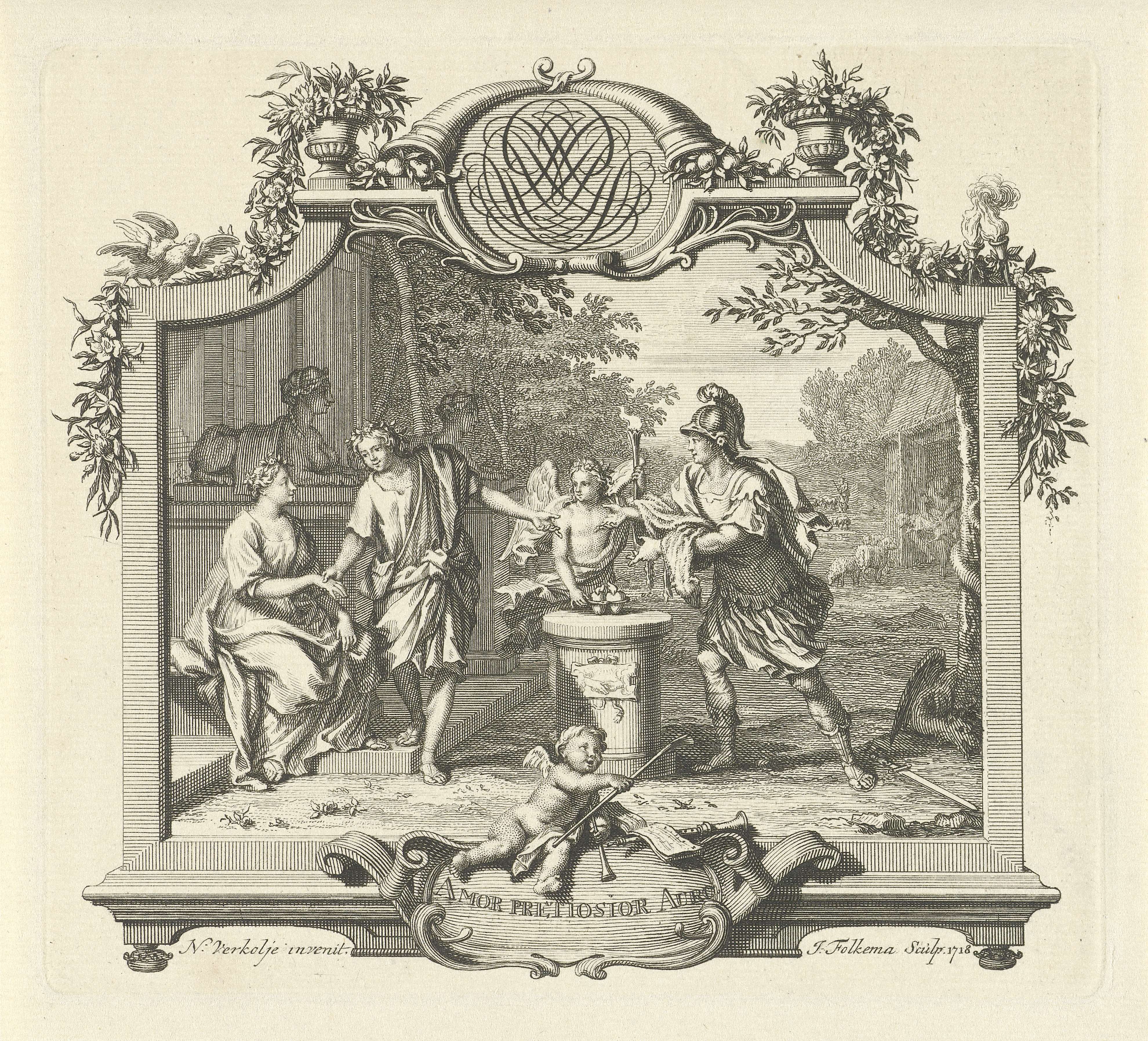 Allegorie op het huwelijk, geplaatst in een sierlijke lijst versierd met bloemen, vogels en bazuinen. Links pakt een man de hand van zijn aanstaande vrouw om haar naar de offerzuil te leiden. De zijkant van de zuil toont de beeltenis van twee ineengeslagen handen, bovenop liggen twee brandende harten die door een engel met een ...