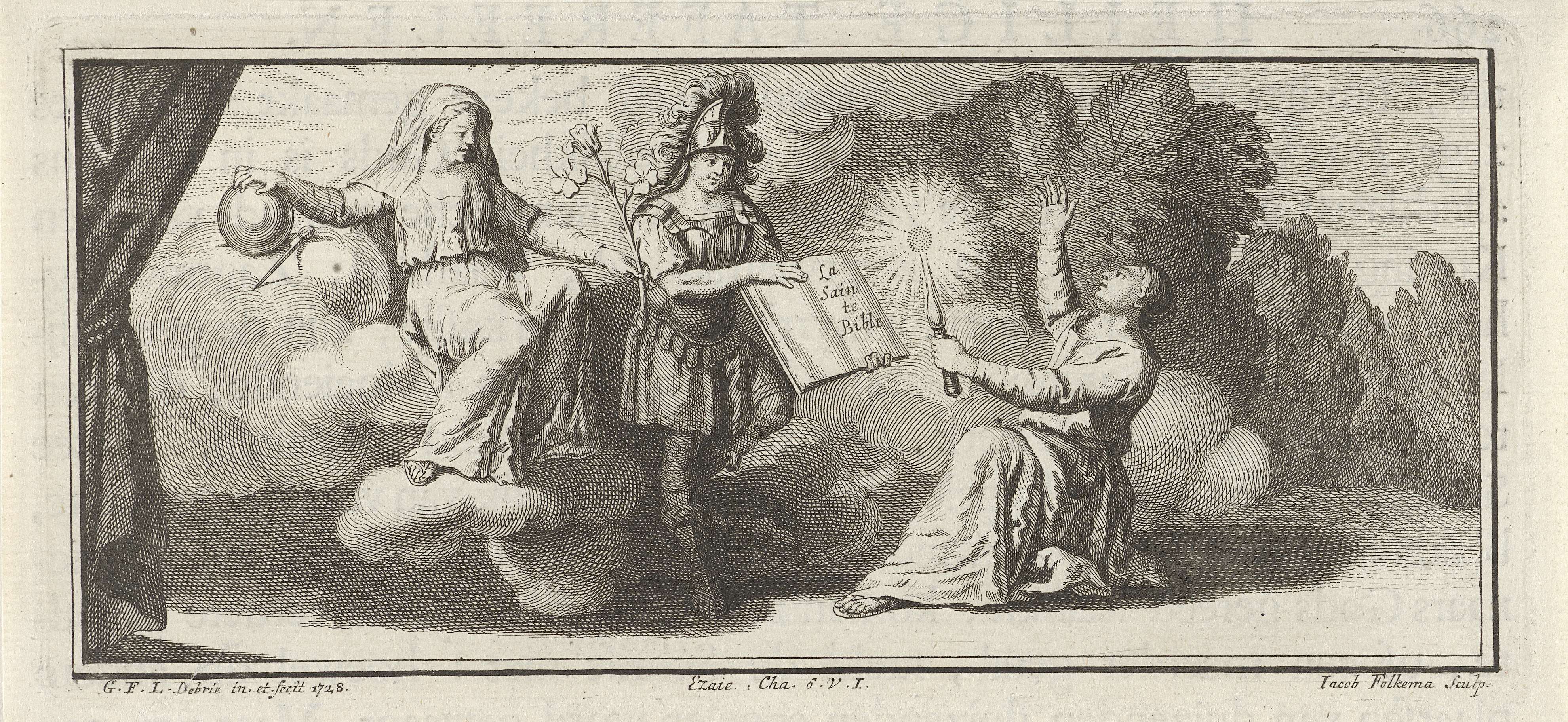 Een ongewapende soldaat toont een opengeslagen bijbel aan een vrouw die geknield voor hem zit. In haar hand houdt ze een staf met stralende bol vast, haar arm heeft ze in de lucht gestoken. Geheel links zit een gesluierde vrouw op een wolk naast een bol, symbool van de goddelijke volmaaktheid, en een meetinstrument. Ze ...