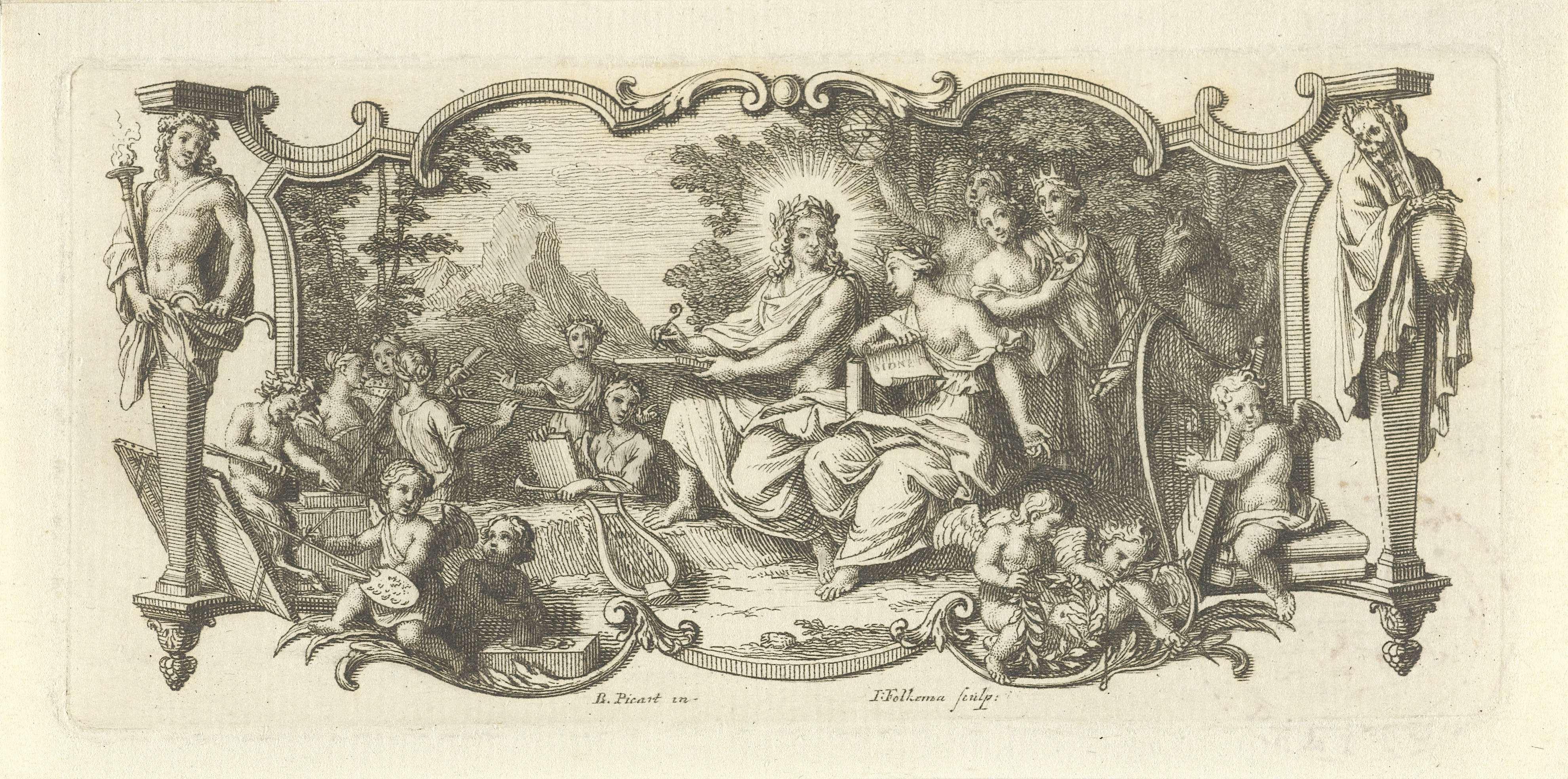De gelauwerde Apollo wordt al schrijvend omringd door zijn negen Muzen. Op de voorgrond spelen links en rechts putti. De voorstelling is gevat in een sierlijke lijst en aan weerszijden met hermen versierd.