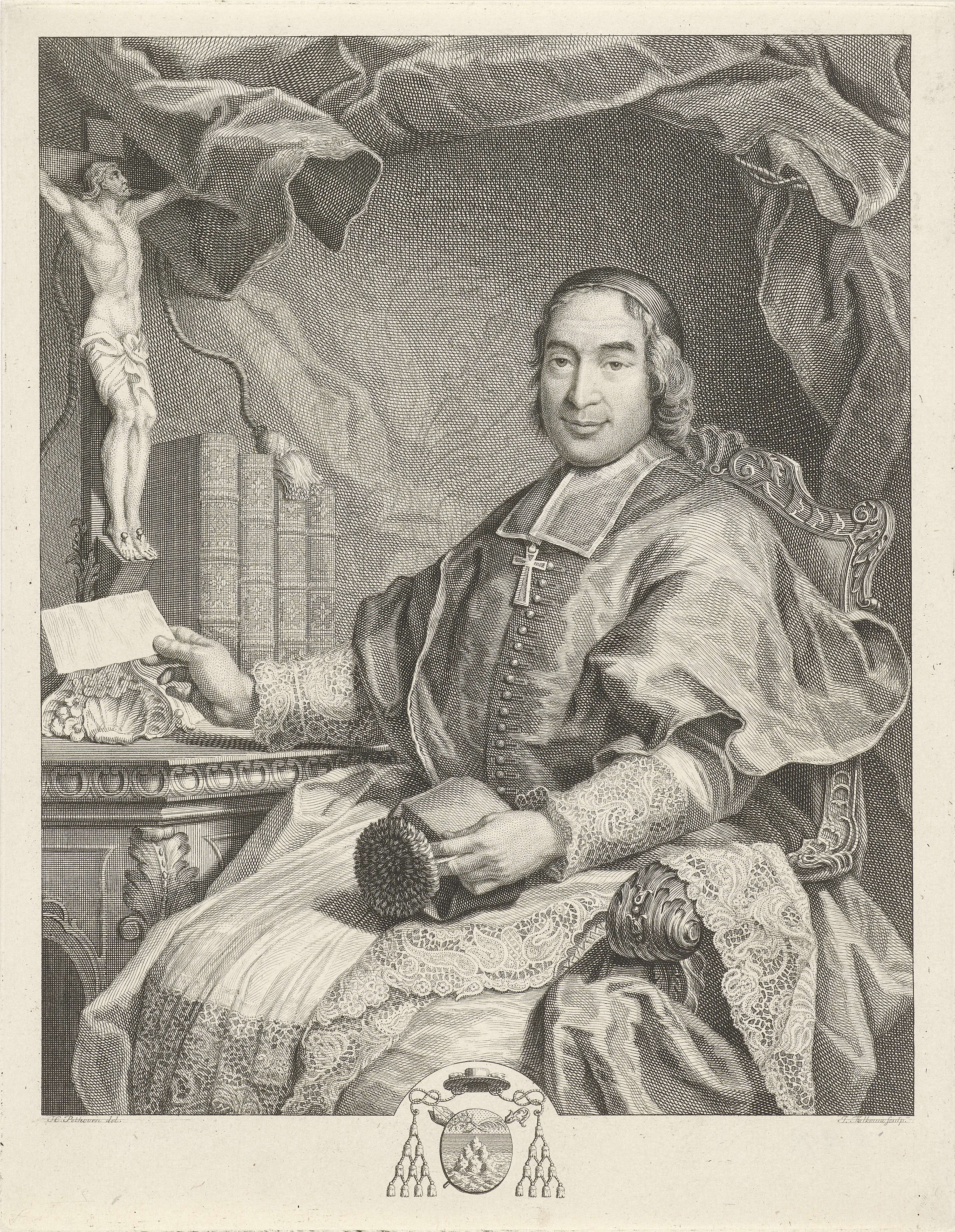 Portret van een onbekende geestelijke, met kalot. Kniestuk, zittend in een stoel naar links gedraaid. In zijn linkerhand houdt de geestelijke zijn biretta en een bloem vast, in zijn rechterhand een door de prentmaker nog te bewerken briefje. Onder het portret staat in de marge het wapen van de geportretteerde.