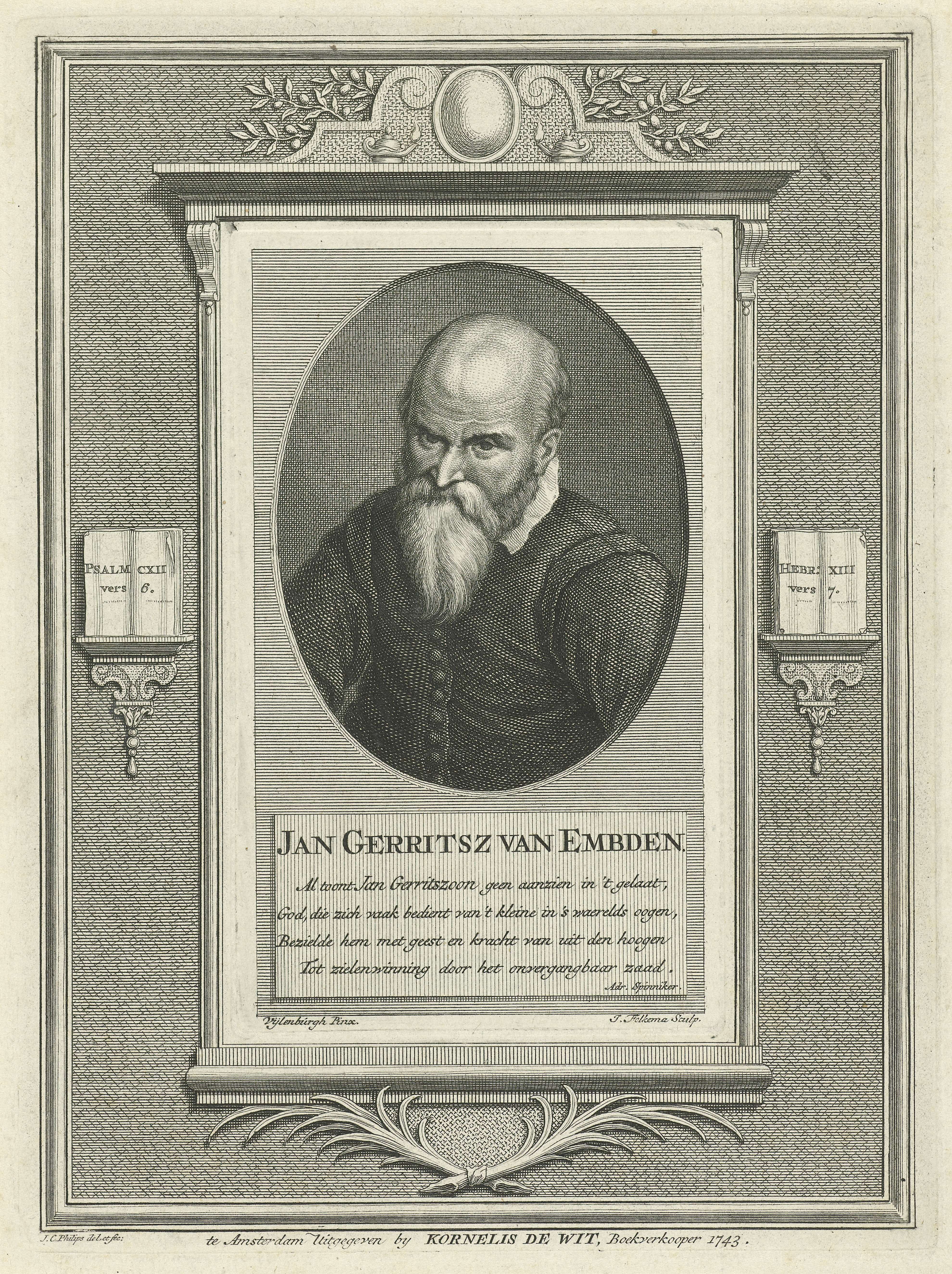 Prent gedrukt van twee platen: Portretbuste in ovaal van predikant Jan Gerrits van Embden, blootshoofds. Onder het portret staan de naam van de geportretteerde en een vierregelig vers in het Nederlands. Het portret is omlijst met een ornamentele rand, gedrukt van een andere plaat, en versierd met palmbladeren en olijftakken. Links en rechts van het ...