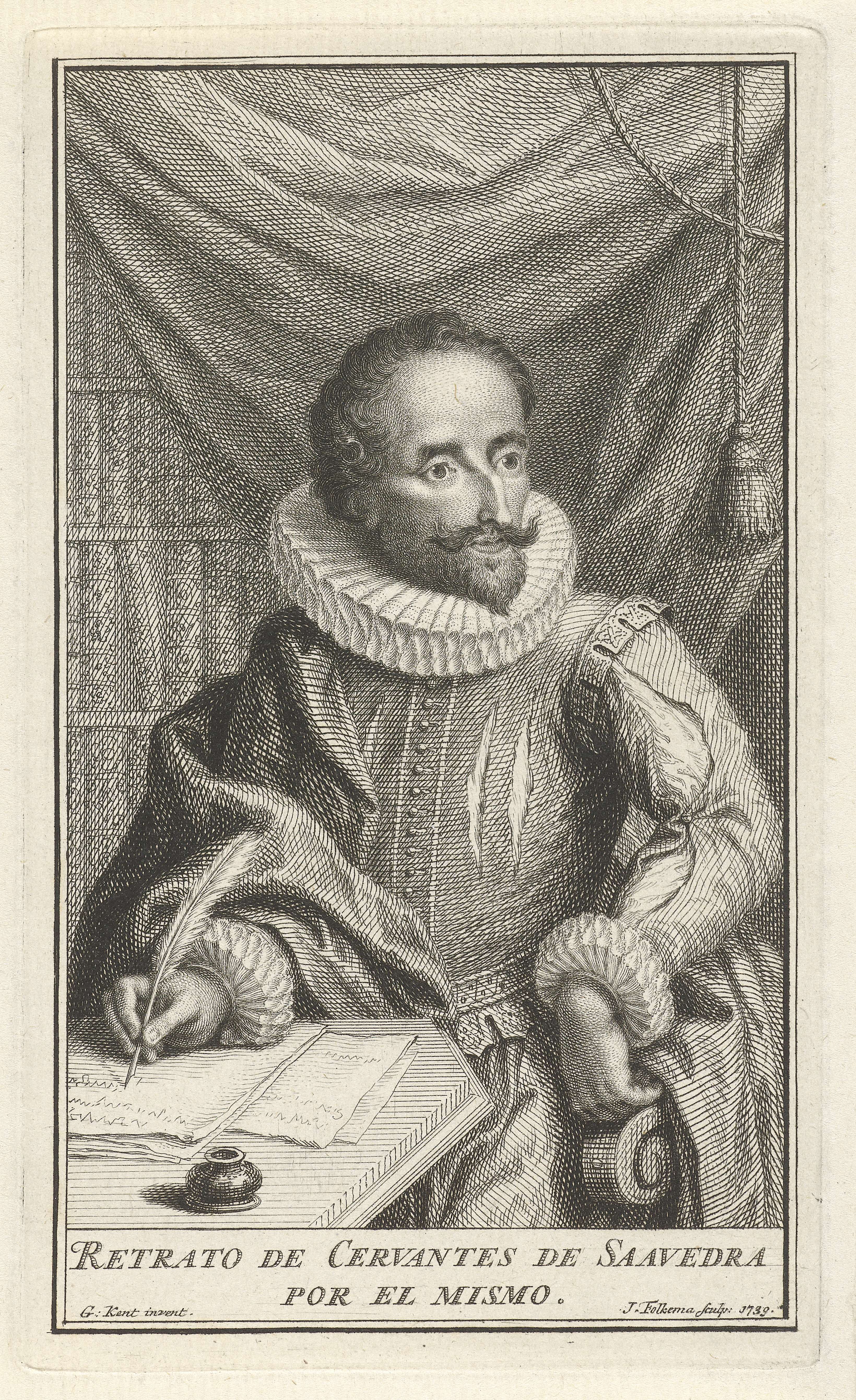 Portret ten halven lijve van de Spaanse schrijver Miguel de Cervantes de Saavedra. De schrijver zit al schrijvend op een blad papier achter zijn bureau. In de marge staan twee regels tekst in het Spaans.