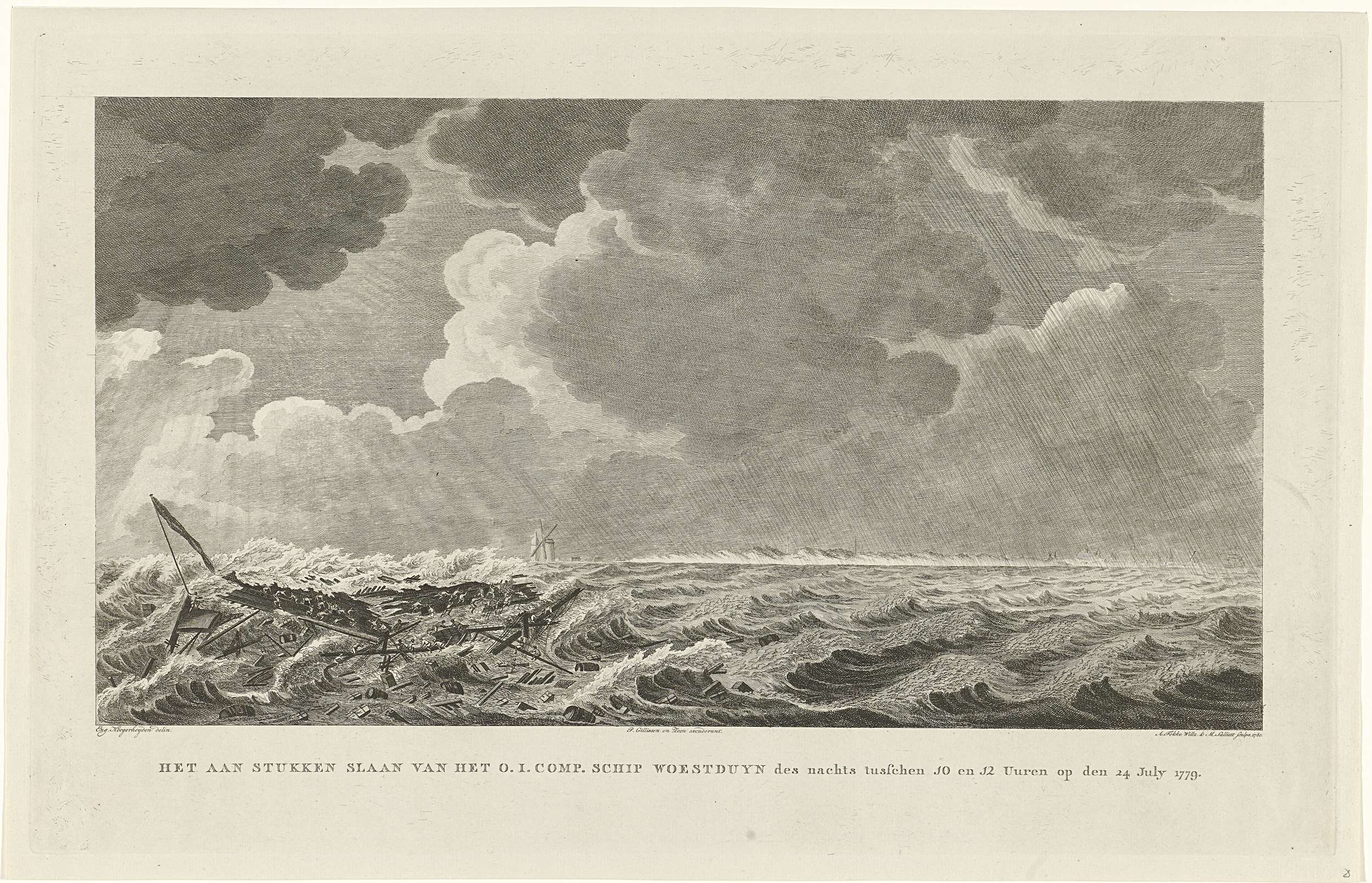 Het VOC-schip 'Woestduin' van de Kamer Amsterdam is vlak voor terugkeer van zijn vijfde thuisreis uit Batavia op de Noorderassen bij Vlissingen vastgelopen. Het uiteengeslagen schip verdwijnt met vlag en al in zee, tientallen mensen klampen zich aan wrakstukken vast.
