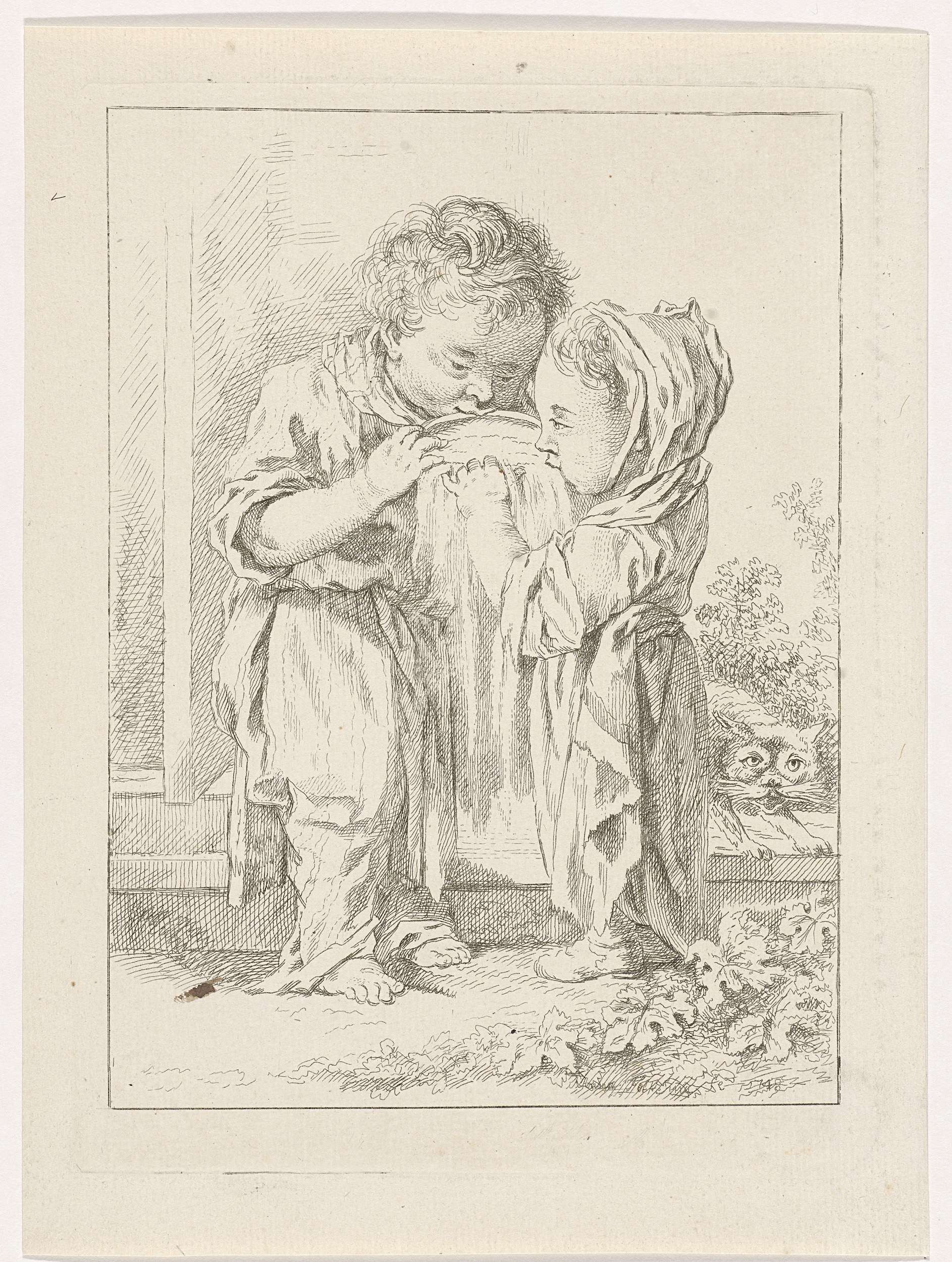 Twee kinderen eten samen uit dezelfde nap. Rechts op de achtergrond staat een kat.