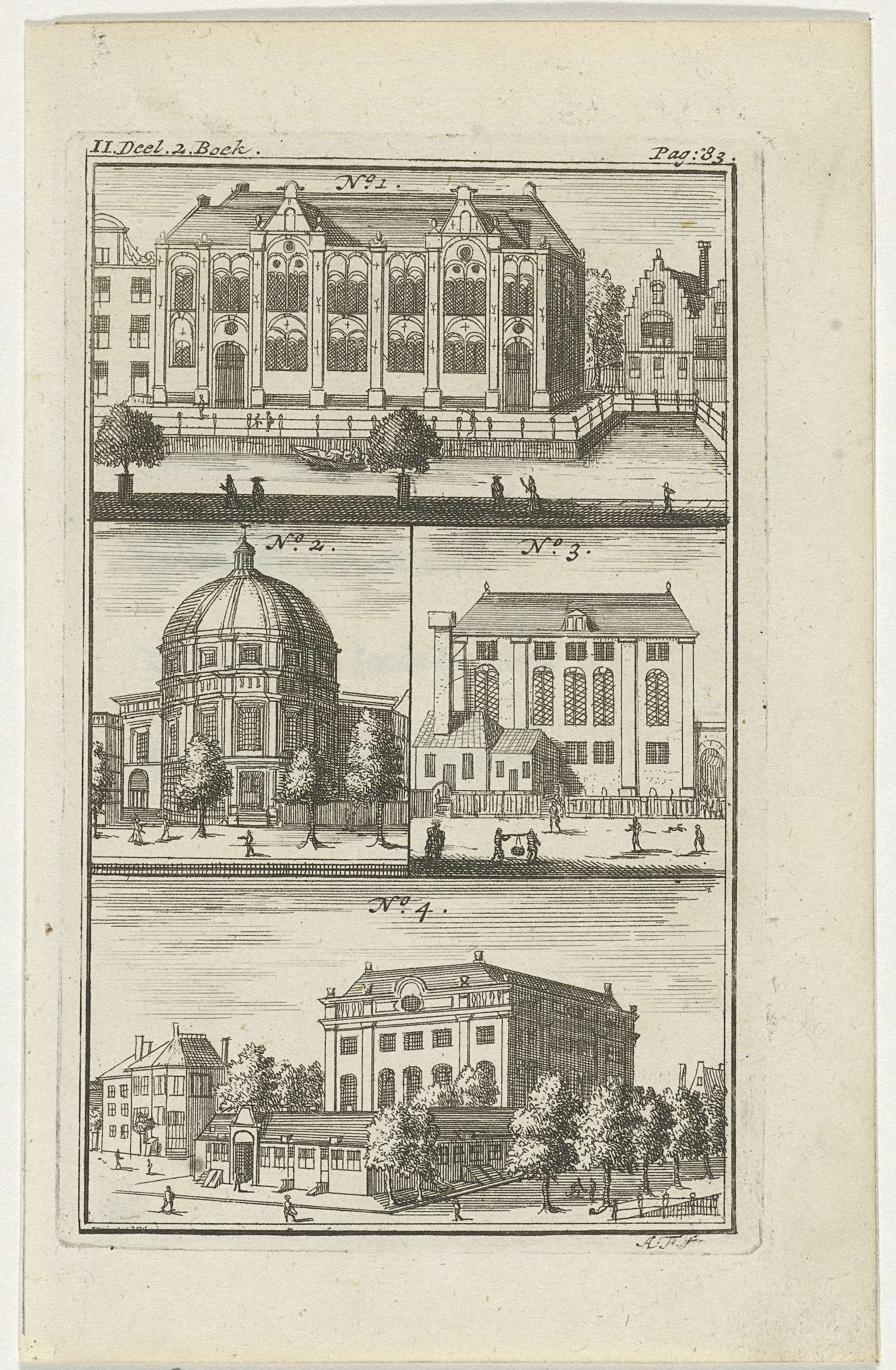 Tekstblad bij boekillustratie met weergave van vier verschillende kerken en synagoges te Amsterdam.