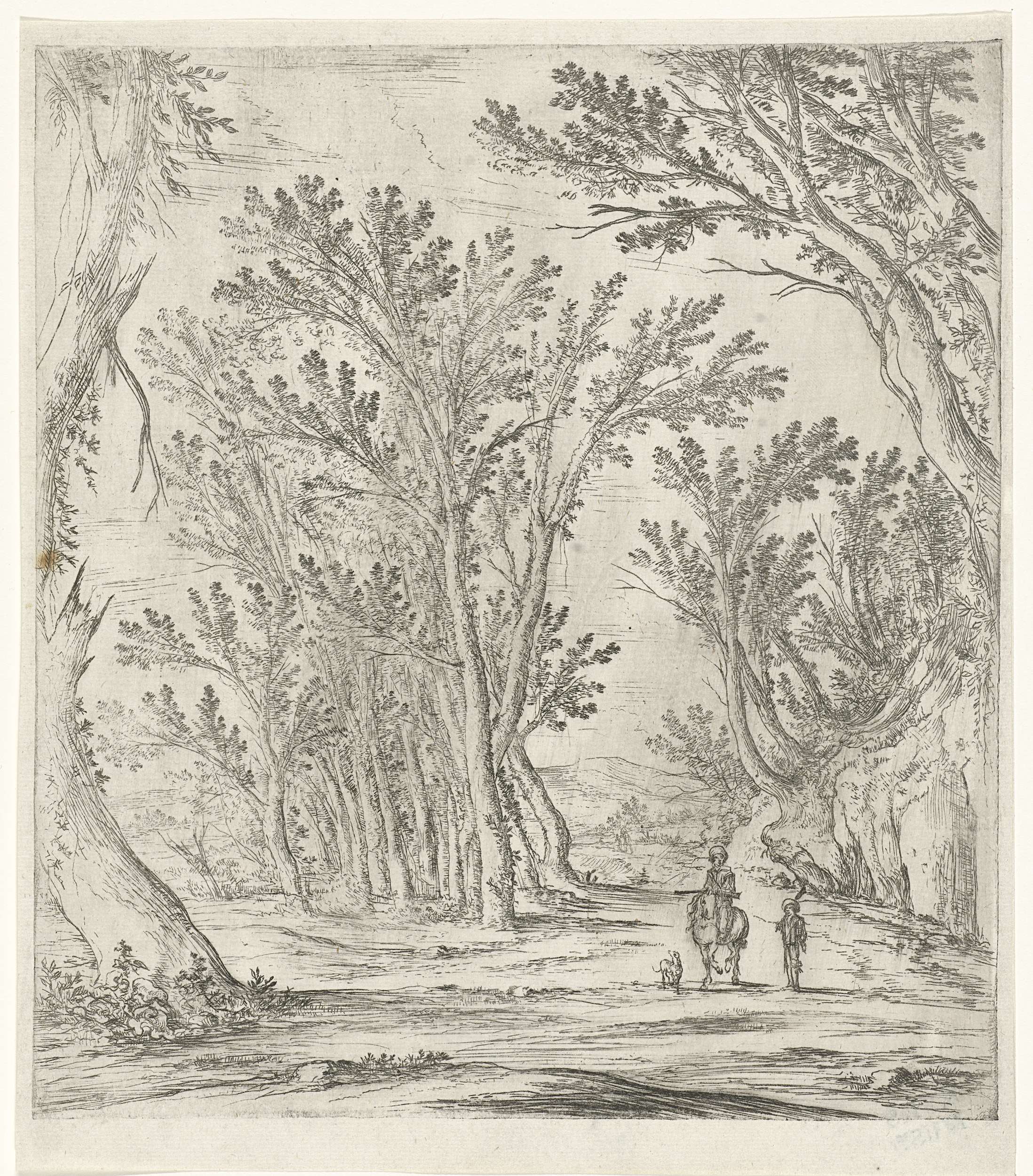 Bospad met rechts een ruiter, een wandelaar en een hond.