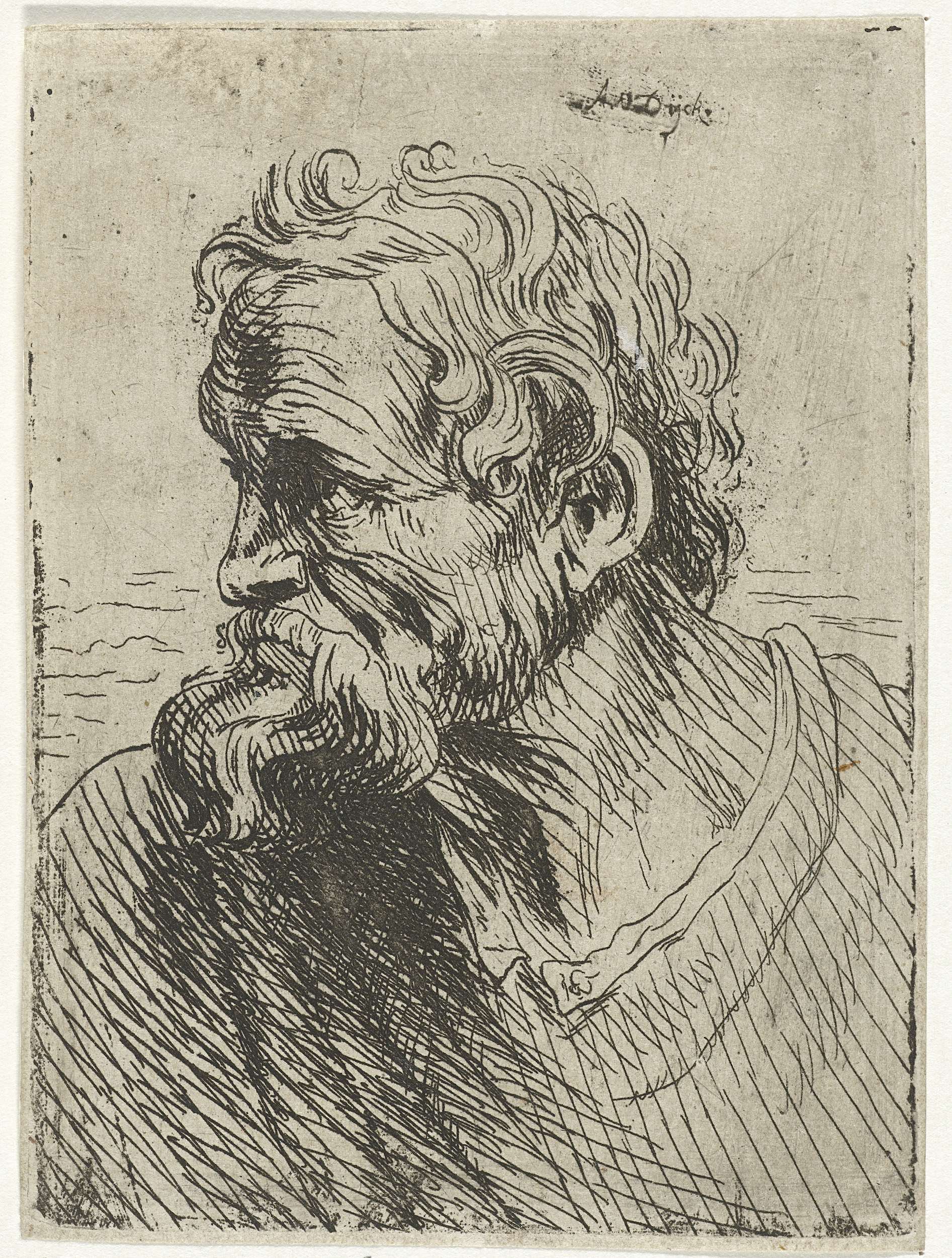 Kop van een oude man met baard, het hoofd is naar links gekeerd.