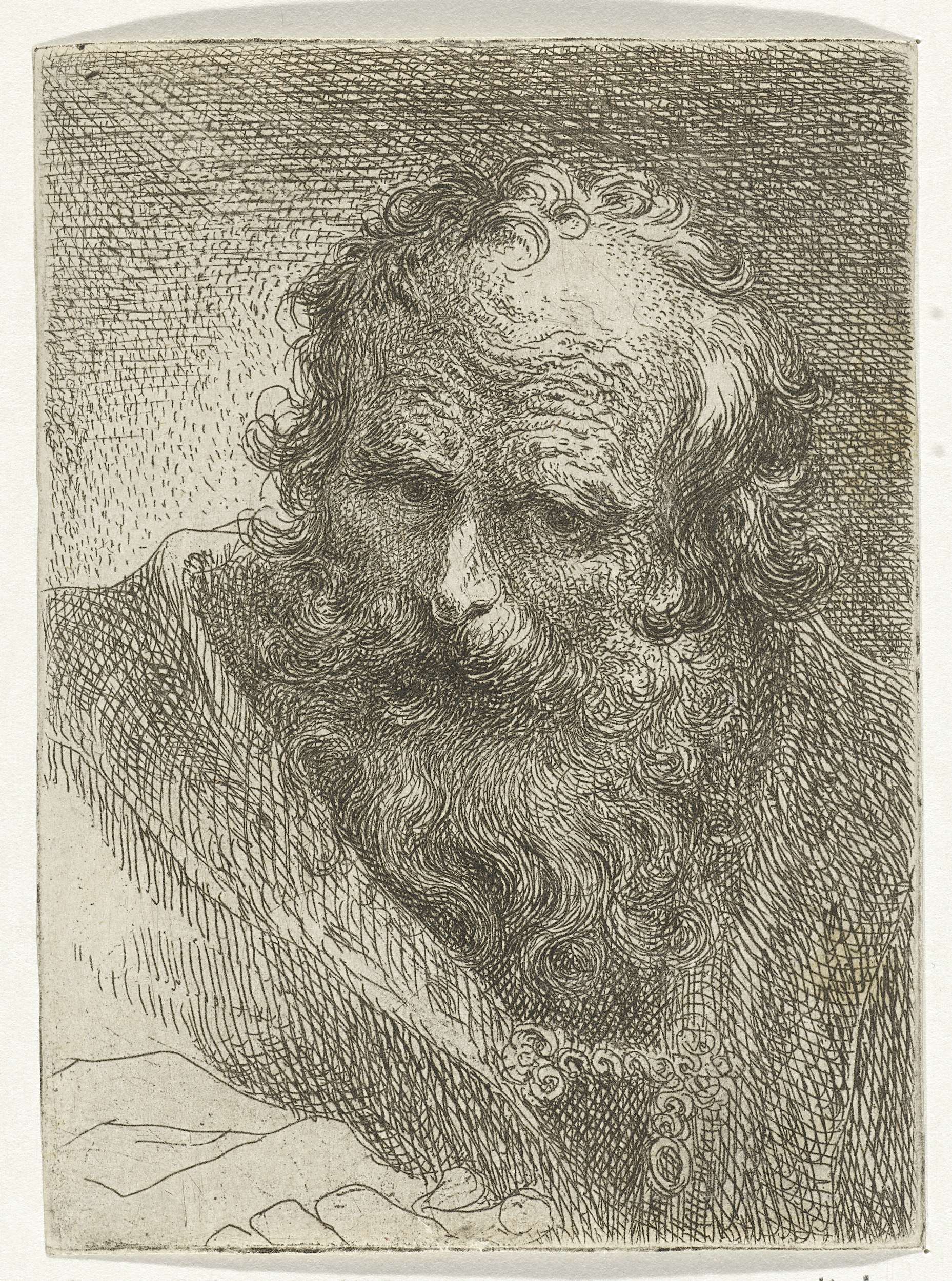 Kop van een oude man met baard, van voren gezien.