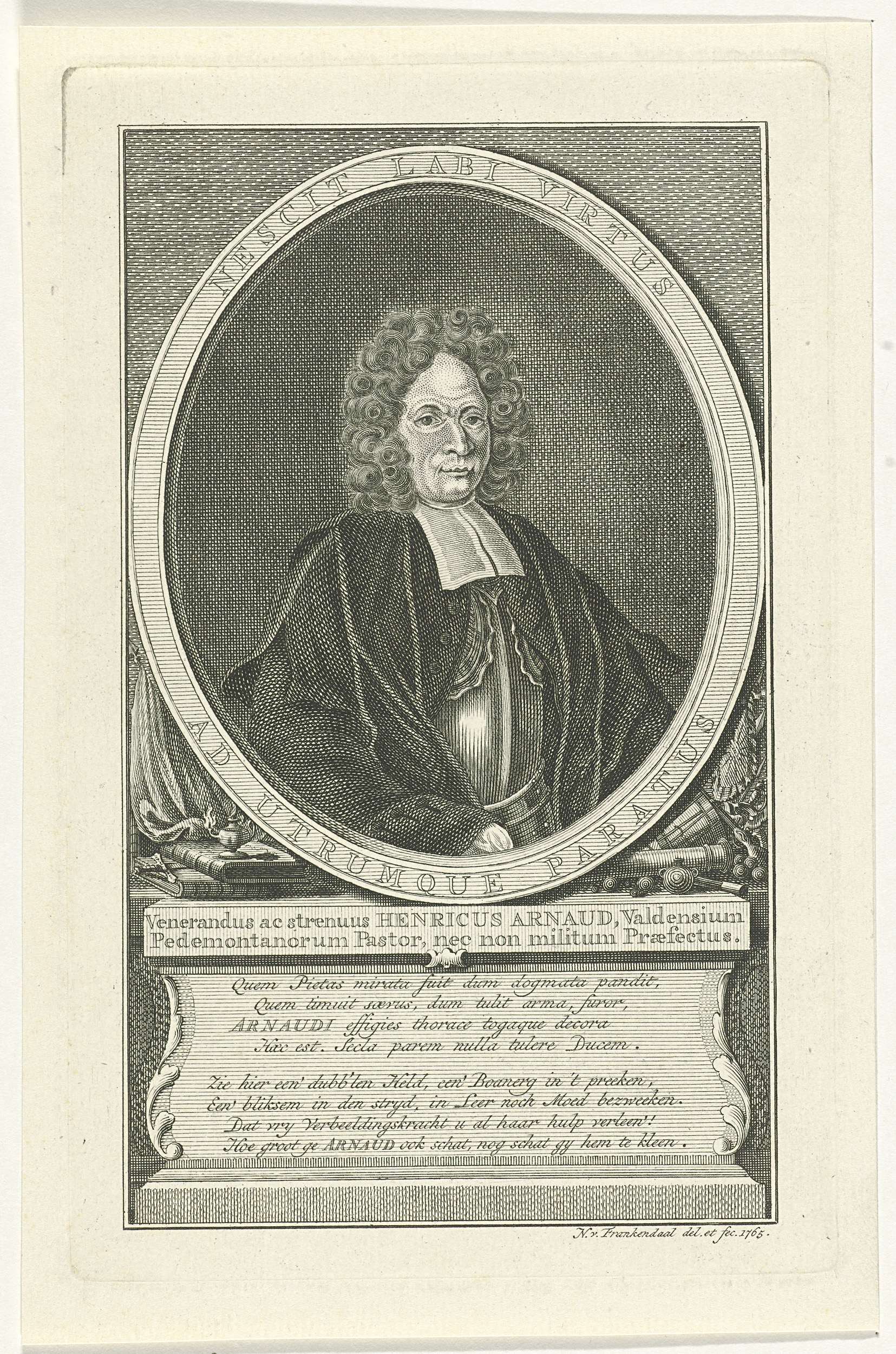 Portret in ovale omlijsting van leraar en veldheer der Waldenzen Hendrik Arnaud, ten halven lijve naar rechts. Arnaud is blootshoofds, draagt een bef en toga en is gehuld in een harnas. Het portret heeft een randschrift en staat op een sokkel waarop een vierregelige tekst in Latijn en Nederlands staat.