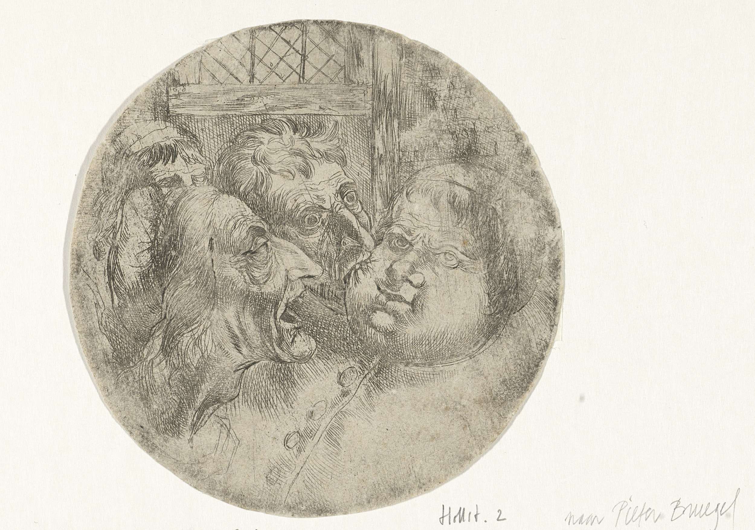 Vier karikaturale mannenhoofden in een cirkel. De geestelijke met kalot rechts vooraan wordt door de man direct naast hem in zijn wang gebeten.