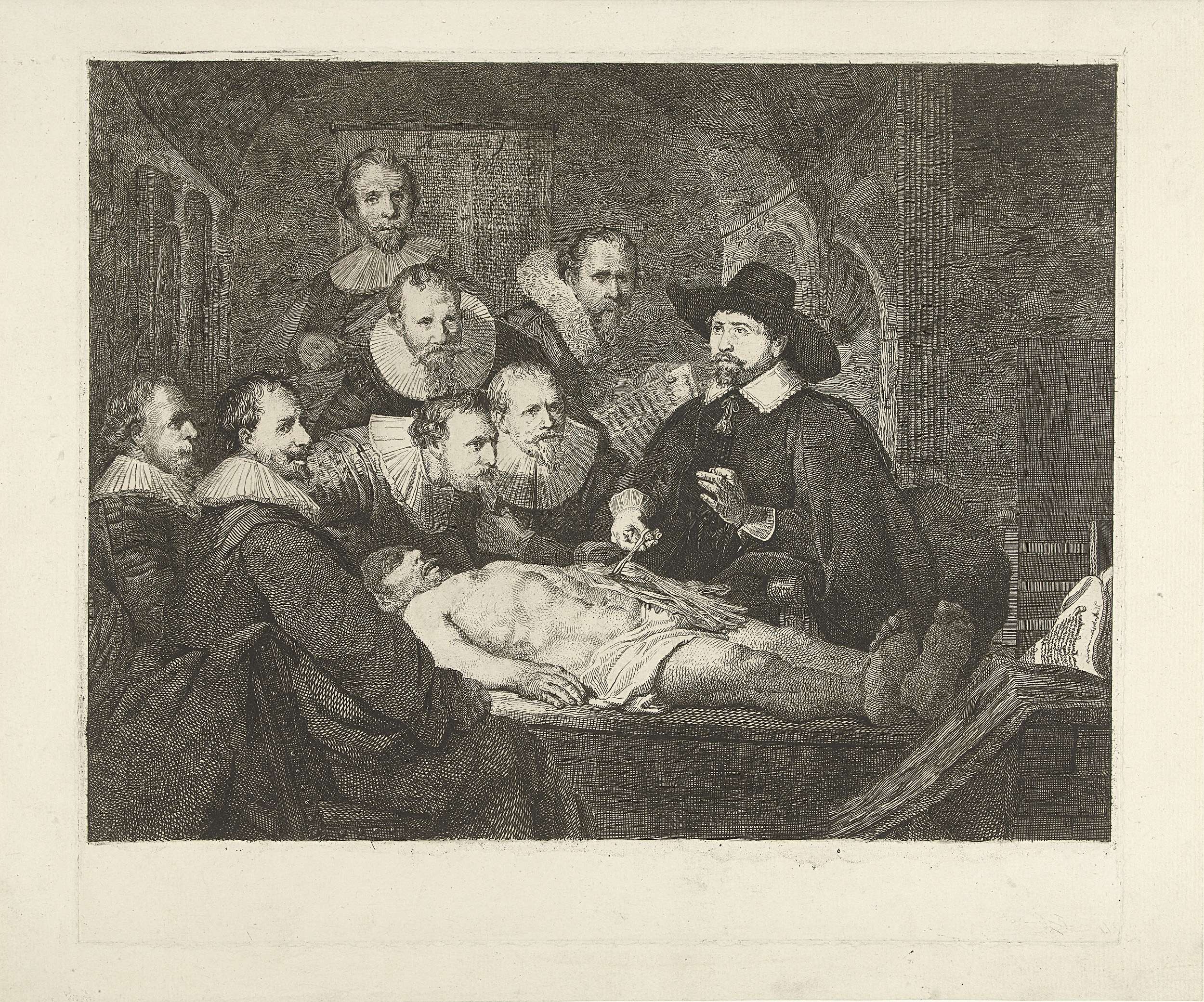 Groepsportret van de Amsterdamse chirurgijns bij een anatomische les. De mannen zitten en staan rond een tafel waarop een lijk ligt. Dokter Nicolaes Tulp geeft onderricht. Hij heeft de arm van het lijk opengelegd en houdt met een tang een bundel armspieren omhoog, terwijl hij met zijn andere hand een demonstrerend gebaar maakt. Naast Nicolaes ...