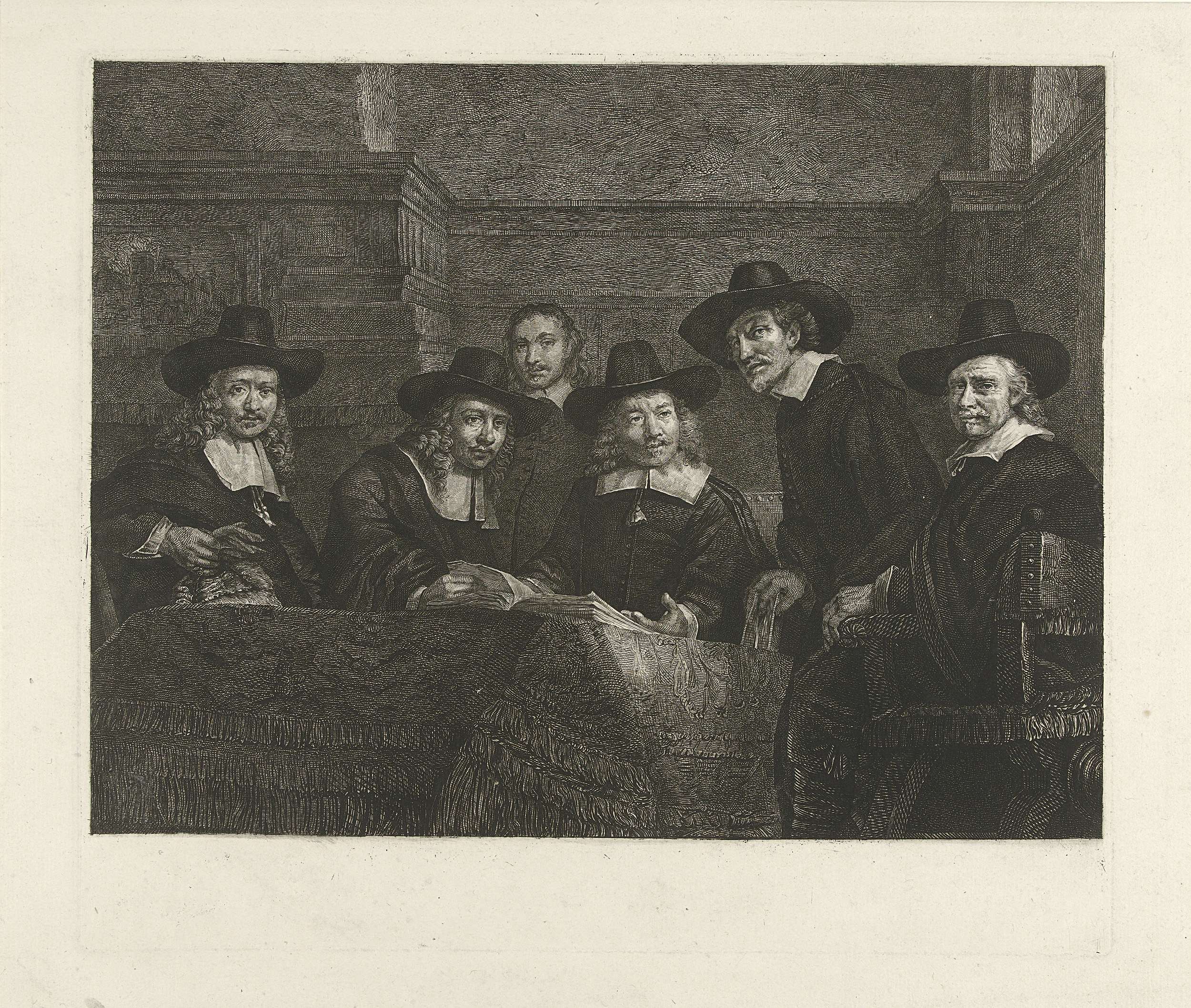 De Staalmeesters: het college van staalmeesters of waardijns van het Amsterdamse lakenbereidersgilde, bijeen rond een tafel waarop een Perzisch kleed ligt, op tafel het opengeslagen stalenboek. Voorgesteld zijn van links naar rechts: Jochem de Neve (1629-81), Aernout van der Mye (ca. 1625-81), de knecht Frans Hendricksz Bel (1629-1701), Willem van Doeyenburg (ca. 1616-87), Volckert Jansz ...