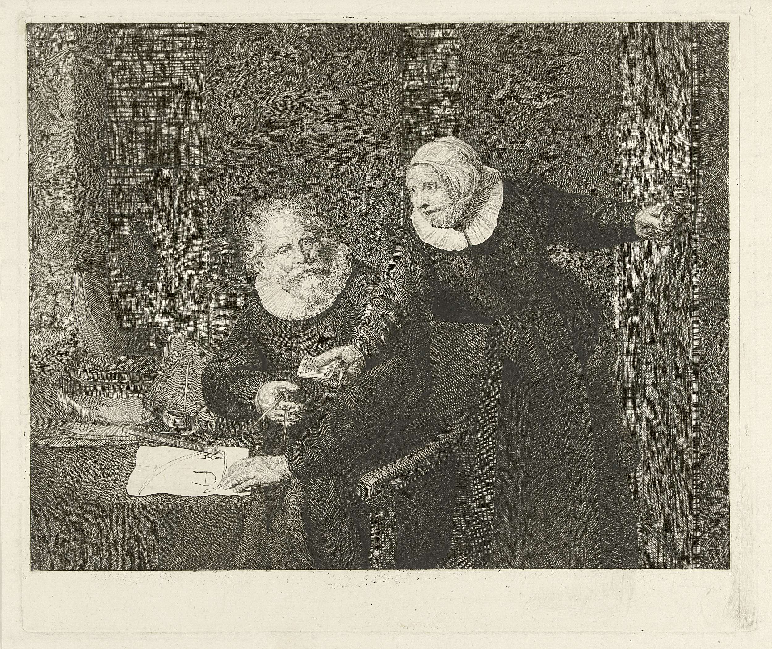Griet Jans komt de kamer binnen om haar man Jan Rijcksen een brief te geven. Met de passer nog in de hand neemt hij de brief aan. Op tafel voor hem ligt het ontwerp van een scheepskiel.