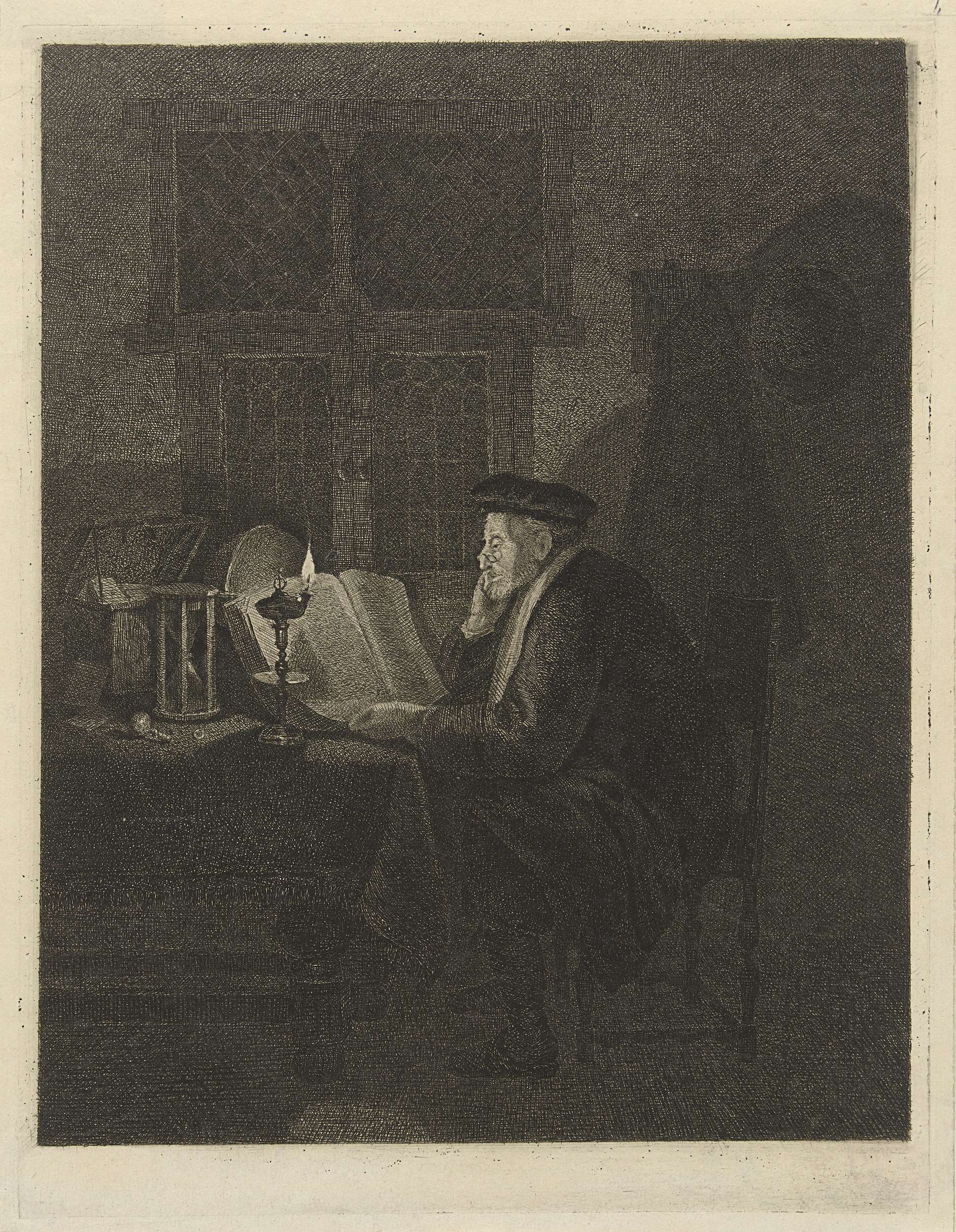 Bij het licht dat afkomstig is van een olielamp bestudeert een man in een verder donkere kamer een boek dat voor hem op tafel ligt. Achter het boek ligt een vergrootglas en staan een geopend kistje gevuld met papier en een zandloper op tafel.