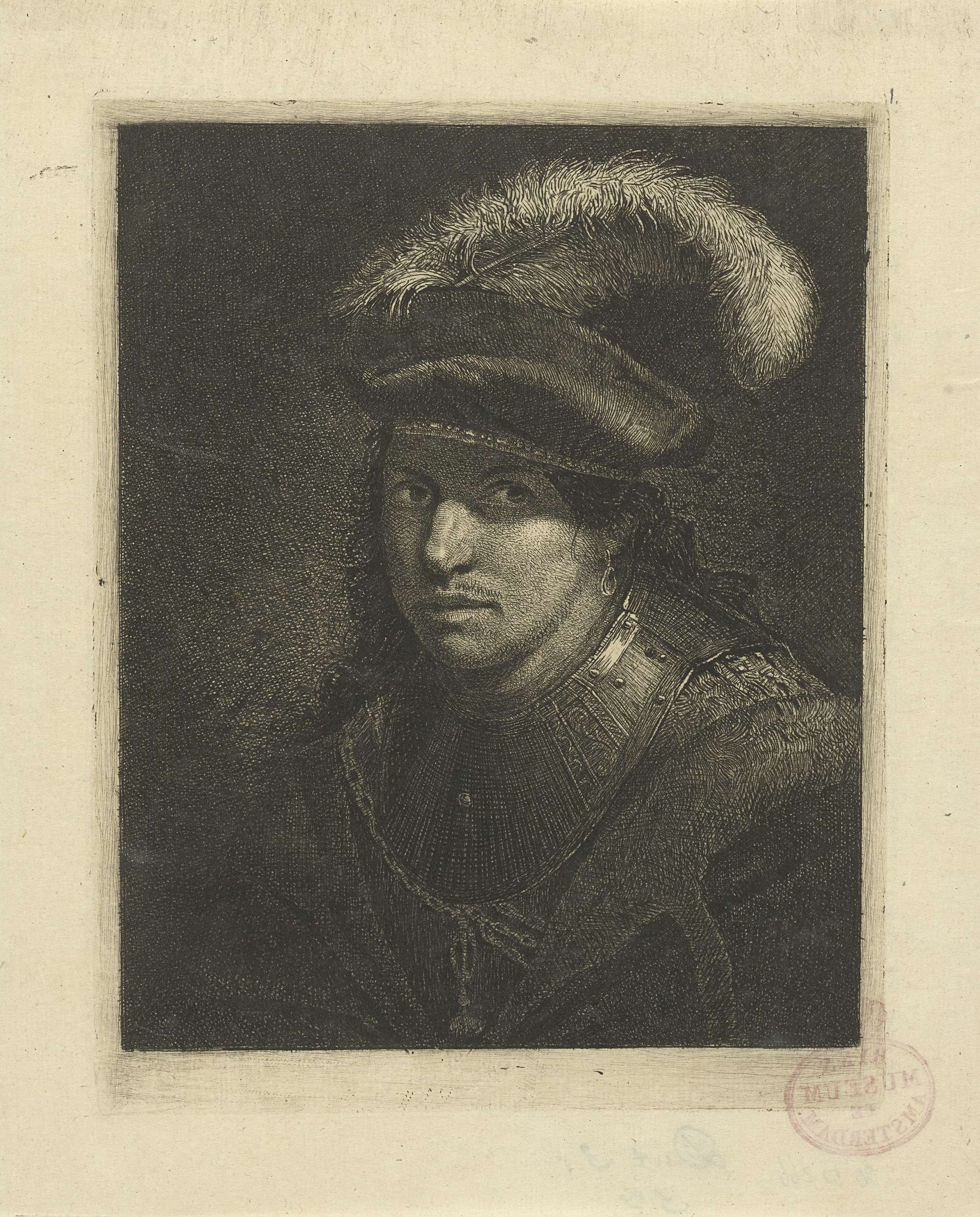 Portret van een onbekende man, ten halven lijve naar links. Zijn baret is getooid met een veer.