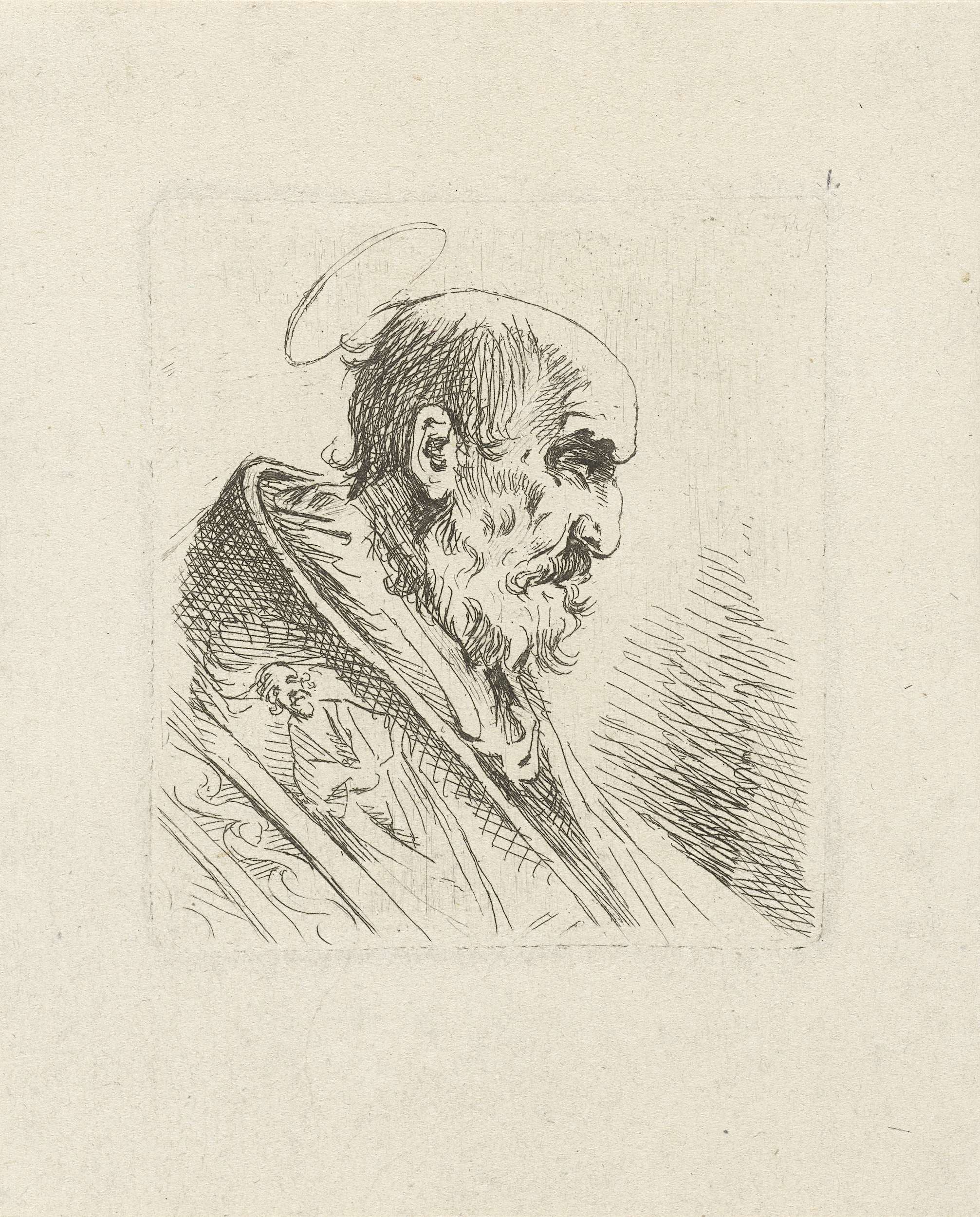 Portret van de heilige Petrus, boven zijn hoofd prijkt een aureool. Portretbuste naar rechts, het gezicht en profil.
