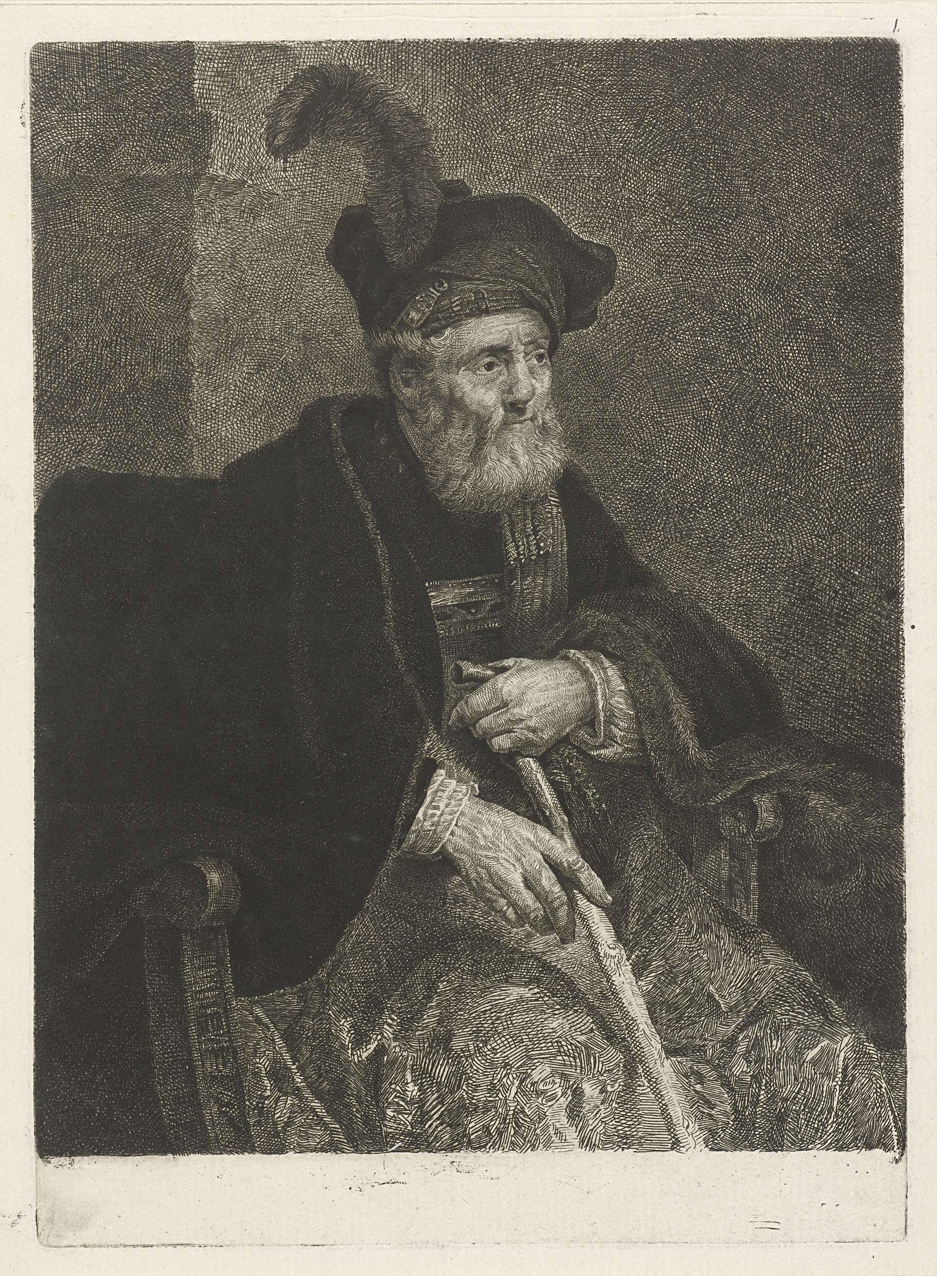 Portret van een onbekende oude man in een stoel. Kniestuk, zittend naar rechts gedraaid. Zijn handen omklemmen een wandelstok. De man is gehuld in een met bont omzoomde mantel, zijn hoofd is getooid met een gevederde hoed.
