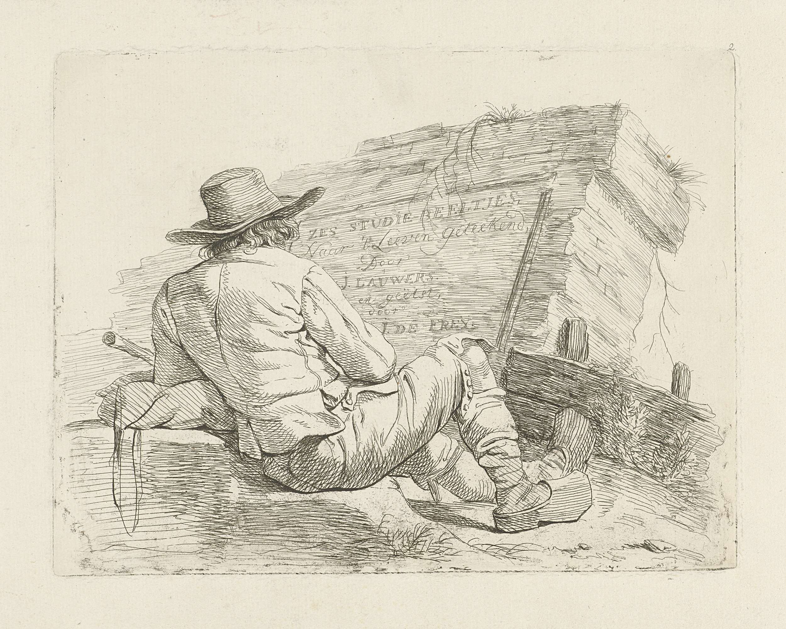 Een man zit, op de rug gezien, voor een muurtje waarop de tekst: Zes Studie-Beeltjes, Naar 't Leeven Getekend, Door J. Lauwers. en geëtst, door J. De Freÿ. De man draagt een hoed op het hoofd en klompen aan de voeten. Titelprent voor een serie etsen door prentmaker J.P. de Frey naar tekeningen van J. ...