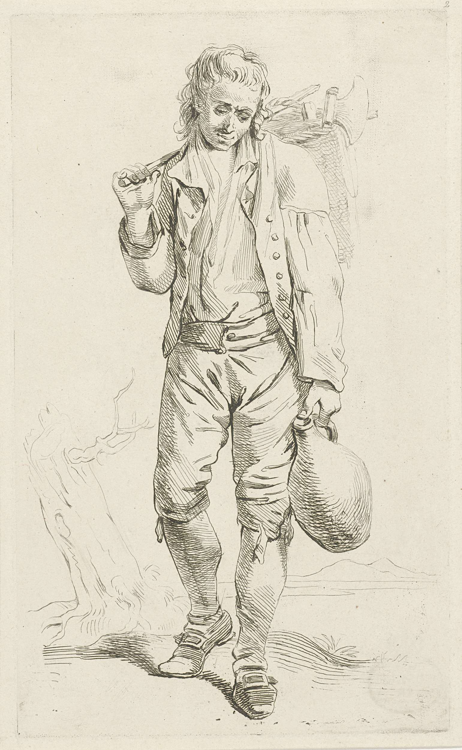 Een boer, ten voeten uit, met een stenen kruik in zijn hand. Over zijn schouder draagt hij een stok waaraan een mand gevuld met gereedschap hangt. Links op de achtergrond staat een boomstronk. Deze prent maakt deel uit van een serie etsen door prentmaker J.P. de Frey naar tekeningen van J. Lauwers.