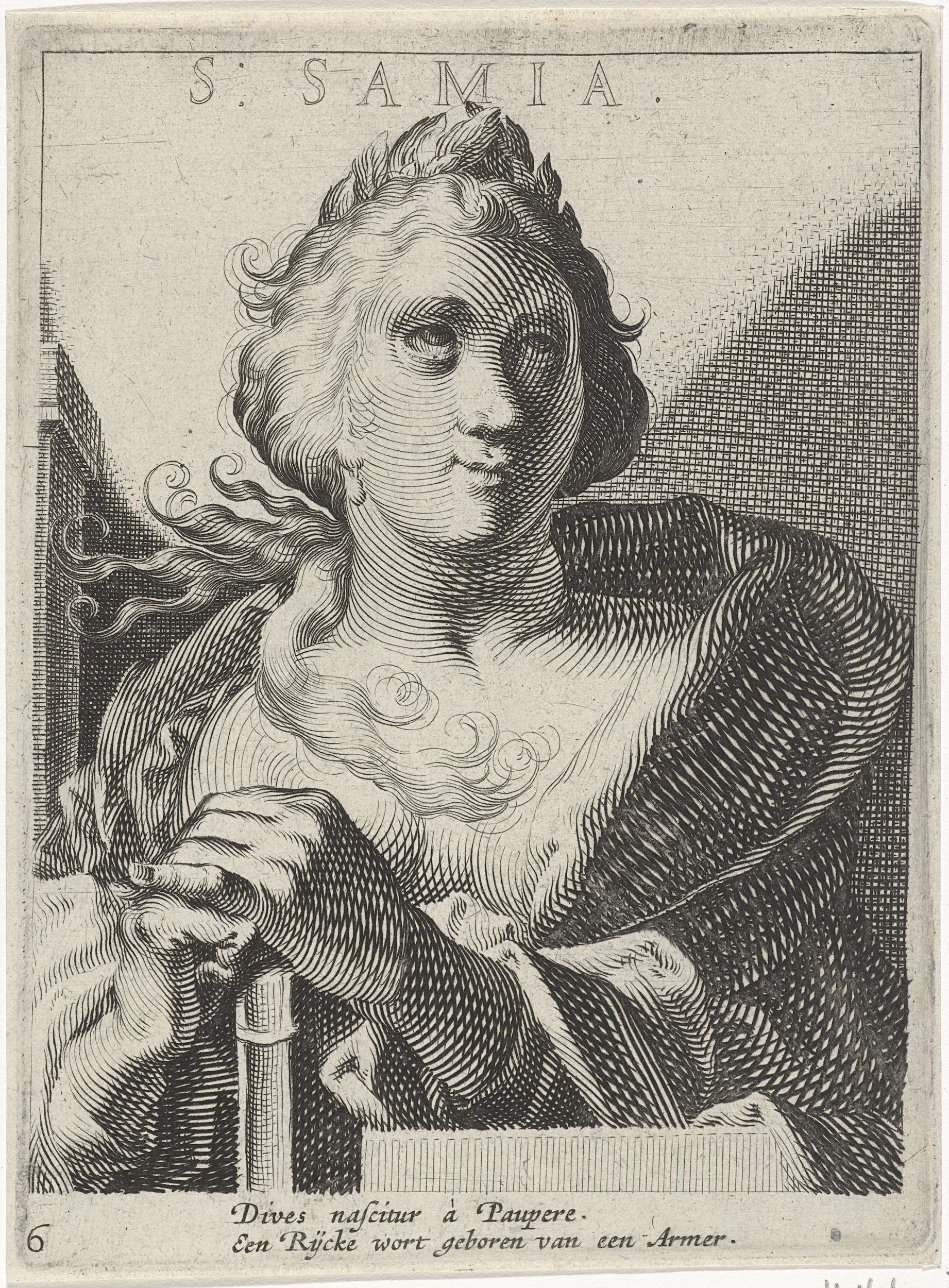 Sibille van Samia, ten halven lijve, met haar handen op een boek.