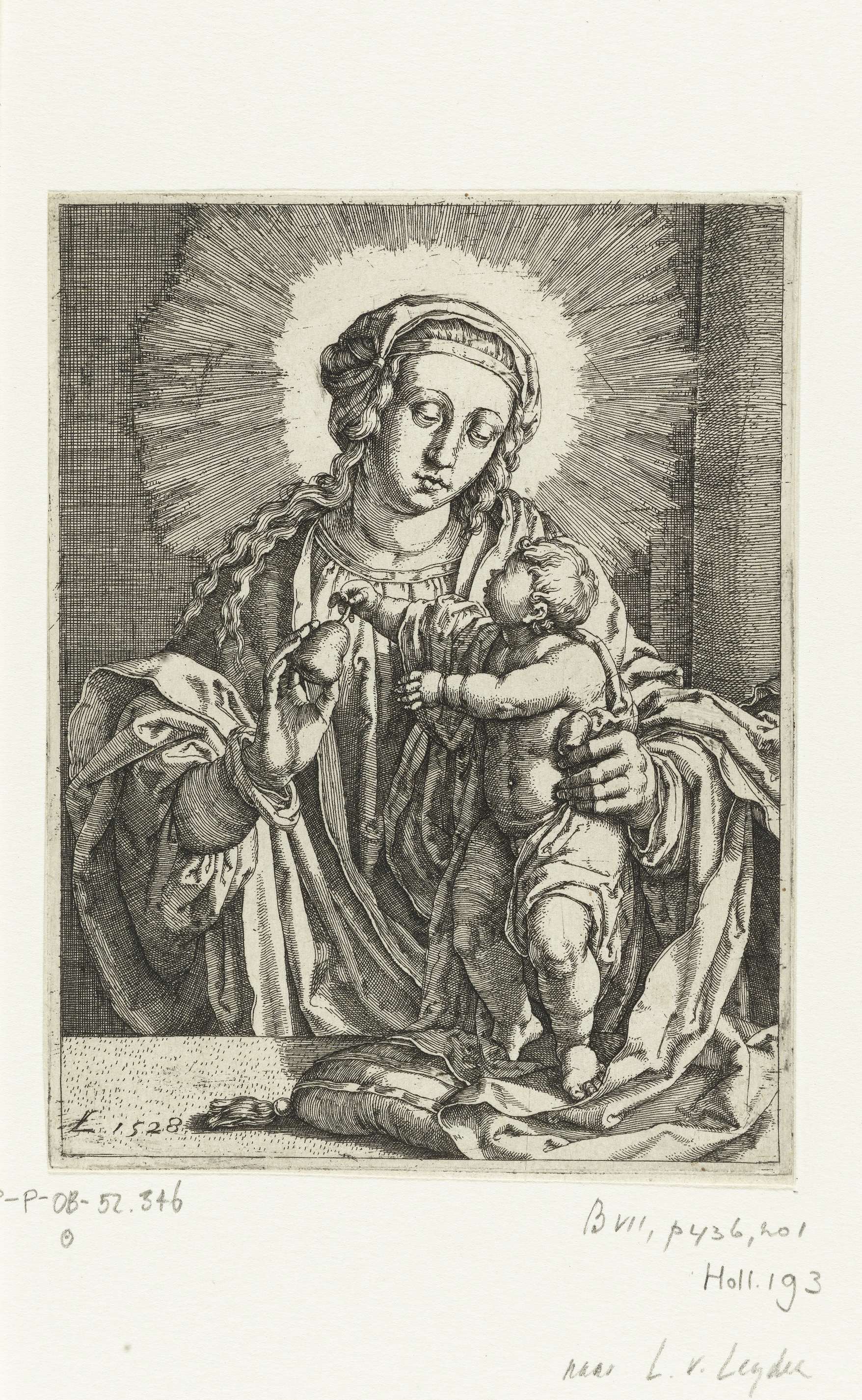 Deze prent is waarschijnlijk gemaakt naar een derde schilderij van Lucas met Maria met kind. Waar dit schilderij zich bevindt is niet bekend. In prent is de compositie van het schilderij spiegelbeeldig weergegeven. Oorspronkelijk zal Maria in dezelfde richting zijn afgebeeld als op de andere schilderijen. Een verschil is de plooival van haar gewaad: die ...