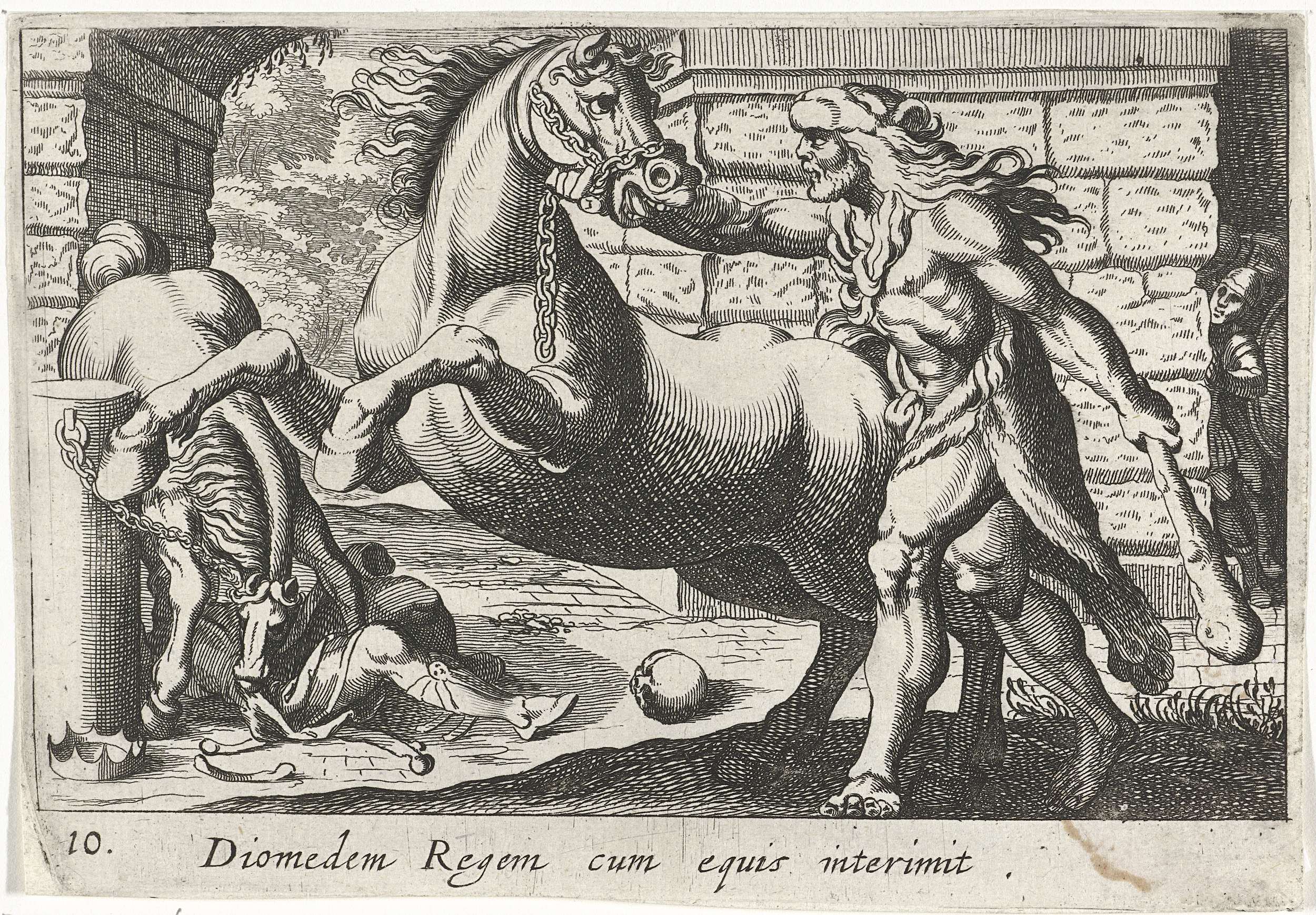 Rechts temt Hercules een vleesetend paard van Diomedes. Links valt Diomedes ten prooi aan zijn eigen paard.