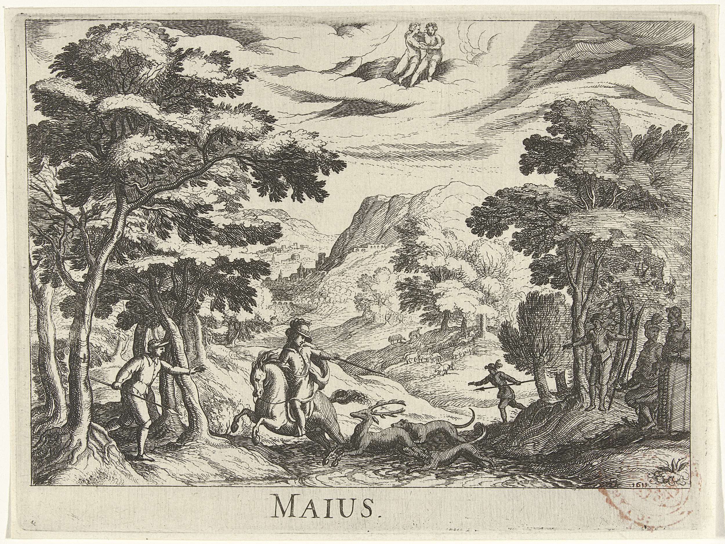 De maand mei wordt voorgesteld door een bosrijk heuvellandschap met jagers. Op de achtergrond is in de lucht het sterrenbeeld Tweelingen weergegeven.
