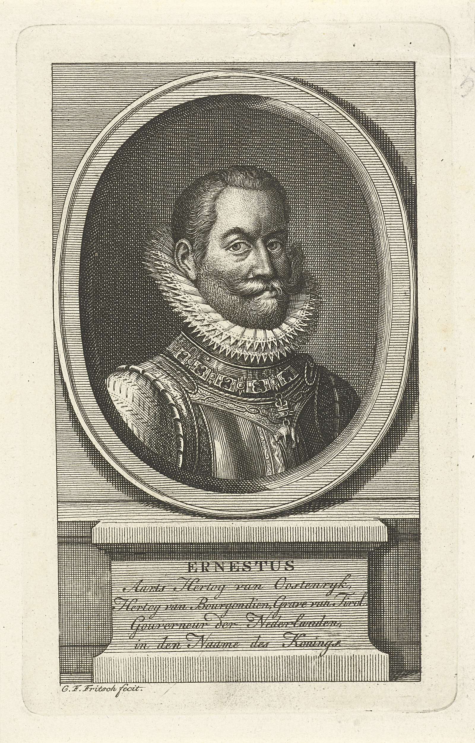 Portretbuste in ovaal naar rechts van Ernst, aartshertog van Oostenrijk, in harnas waarboven een brede plooikraag. Om zijn hals een keten met het symbool van de Orde van het Gulden Vlies. Onder het ovaal staan op een sokkel zijn naam en titels vermeld.