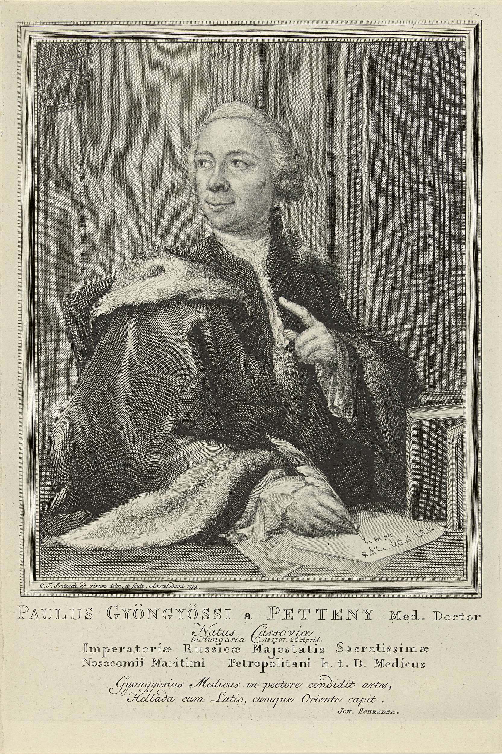 De Hongaarse arts en letterkundige Paulus Gyöngyösi, schrijvend met een ganzenveer, zittend achter een bureau. Gyöngyösi kijkt naar links, met opgeheven vinger. Onder het portret staan onder zijn naam en titels vier regels tekst, geheel in het Latijn.