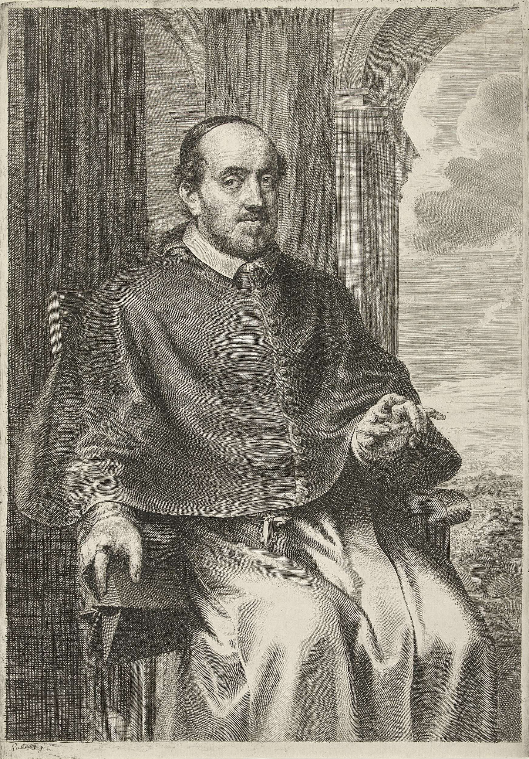 De bisschop van leper, Marius Ambrosius Capello, zittend in een stoel. Kniestuk. Hij houdt in zijn rechterhand een bisschopsmuts vast, zijn hoofd is getooid met een kalot.