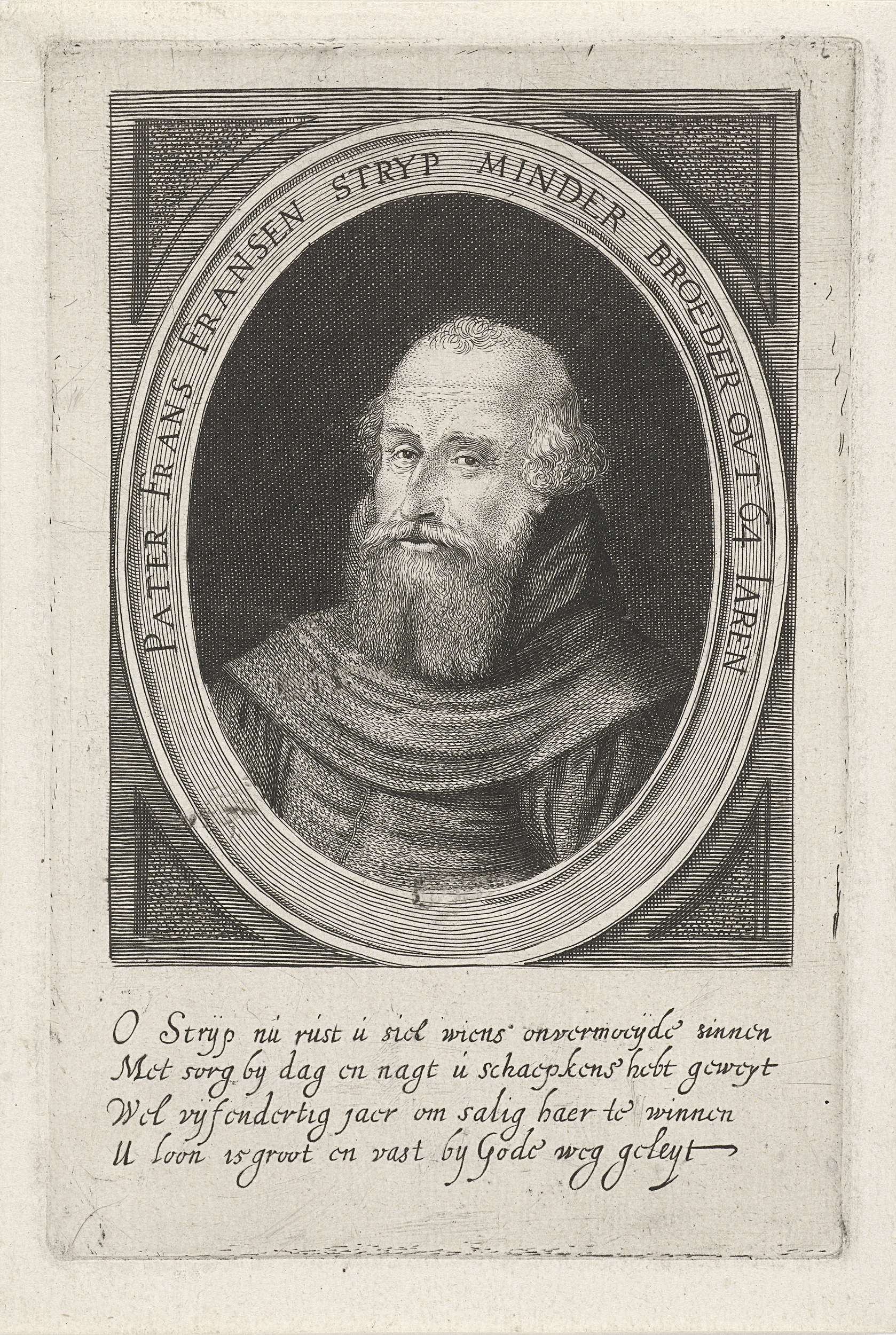 Portretbuste naar rechts van minderbroeder Franciscus Strijp, in ovaal met randschrift. In de marge onder het portret een vierregelige tekst in het Nederlands.
