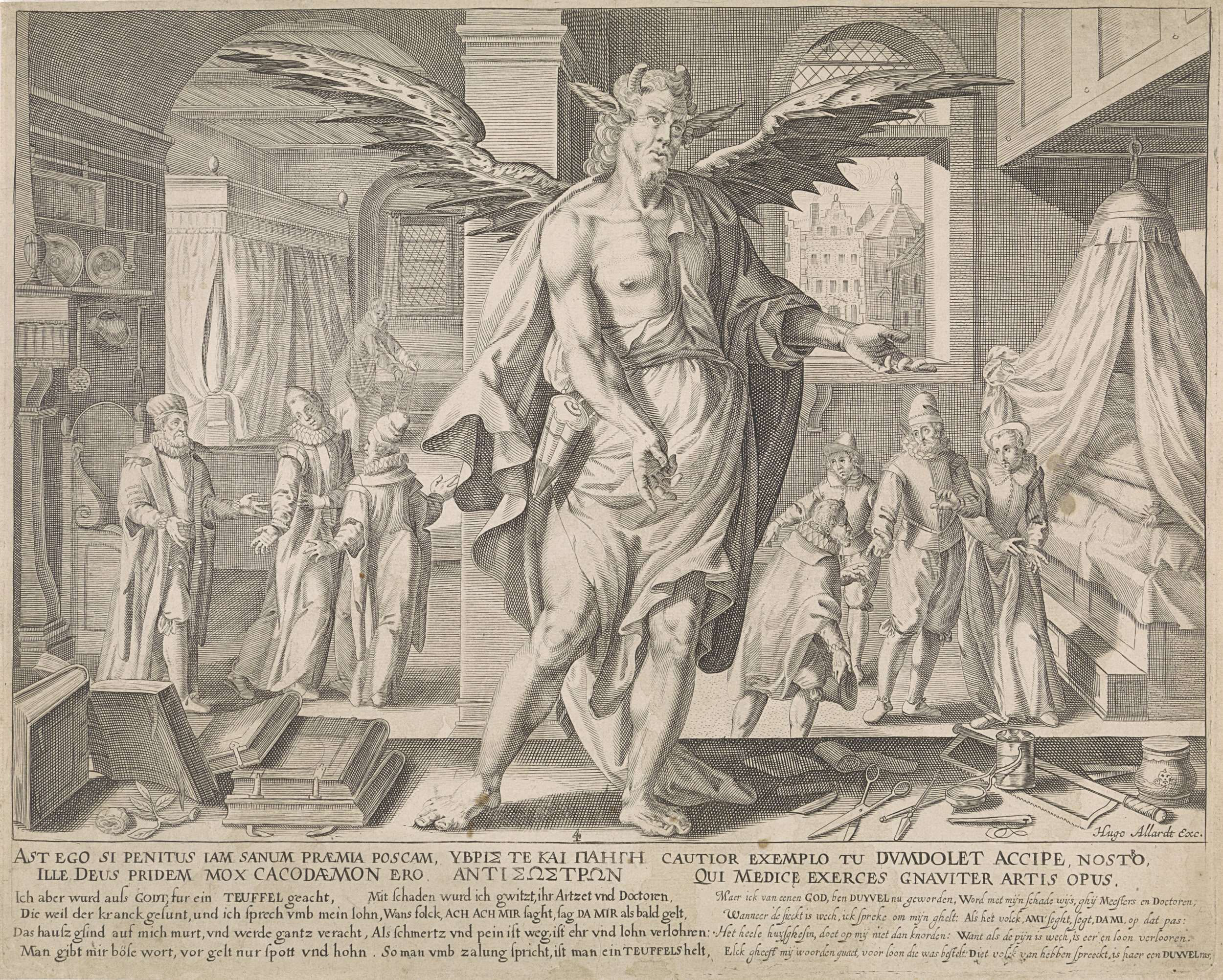 In het midden een duivel. Rondom hem liggen de instrumenten van de geneeskunde. Op de achtergrond het interieur van een woonhuis. Links en rechts verzoeken twee geneesheren betaald te worden voor hun diensten. Dit wordt echter geweigerd. Wanneer een zieke volledig genezen is, wordt een geneesheer beschouwd als een op geld beluste duivel. De prent ...