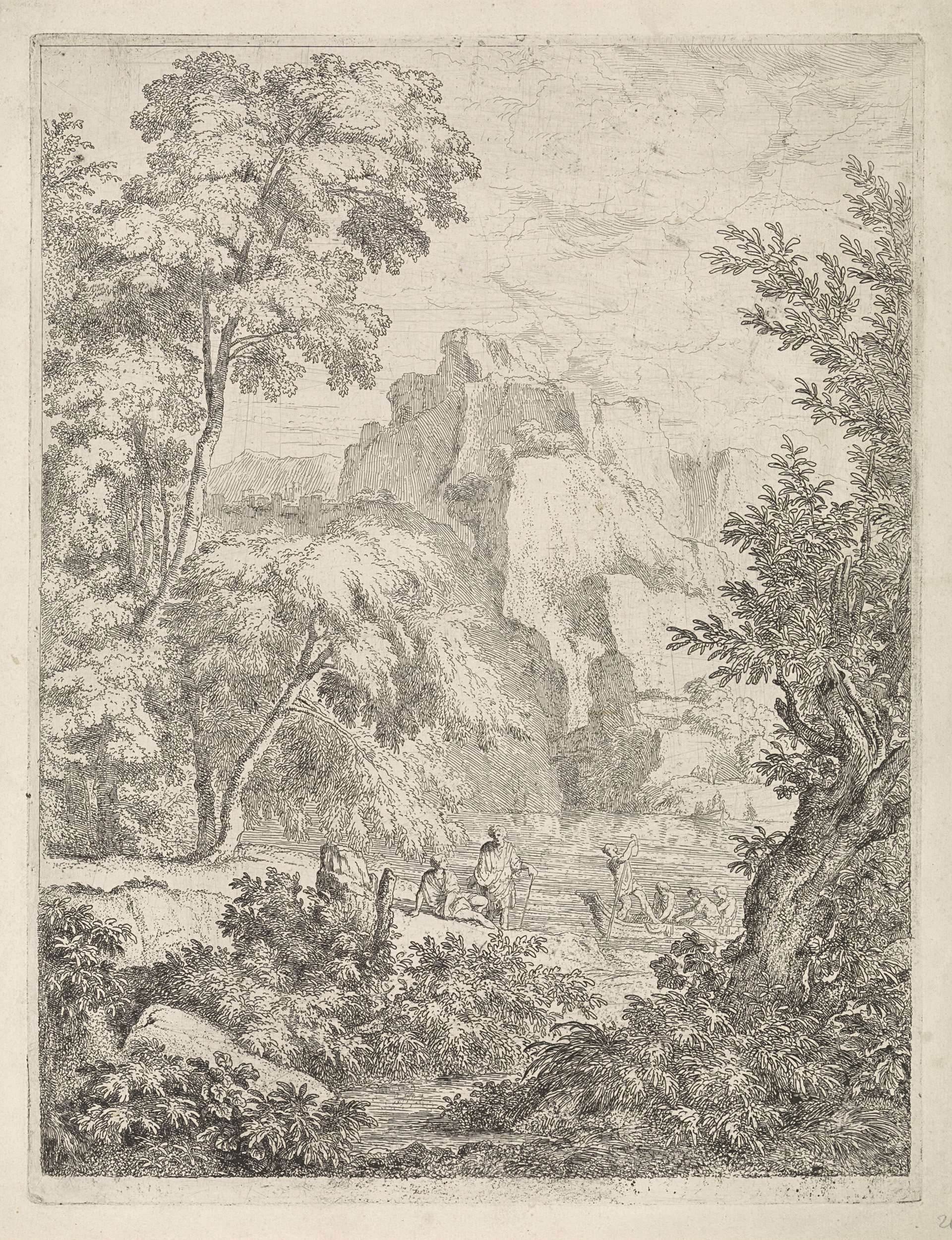 Een bergachtig landschap. Aan de oever van een meer wachten twee mannen op de aankomst van het veerpont.