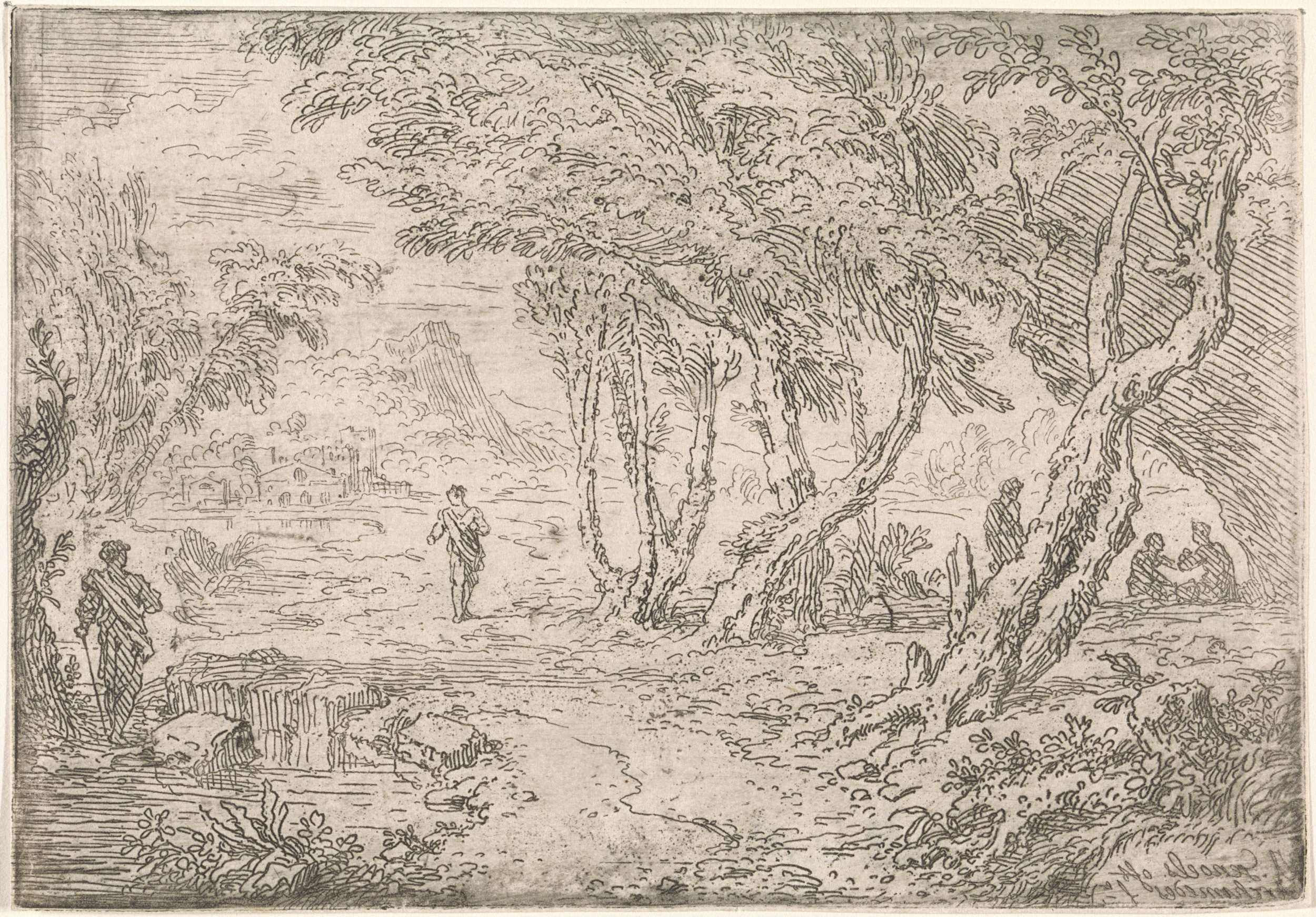 Een landschap met bomen aan de oever van een meer. Enkele figuren zitten onder een rotswand. Op de achtergrond een stad.