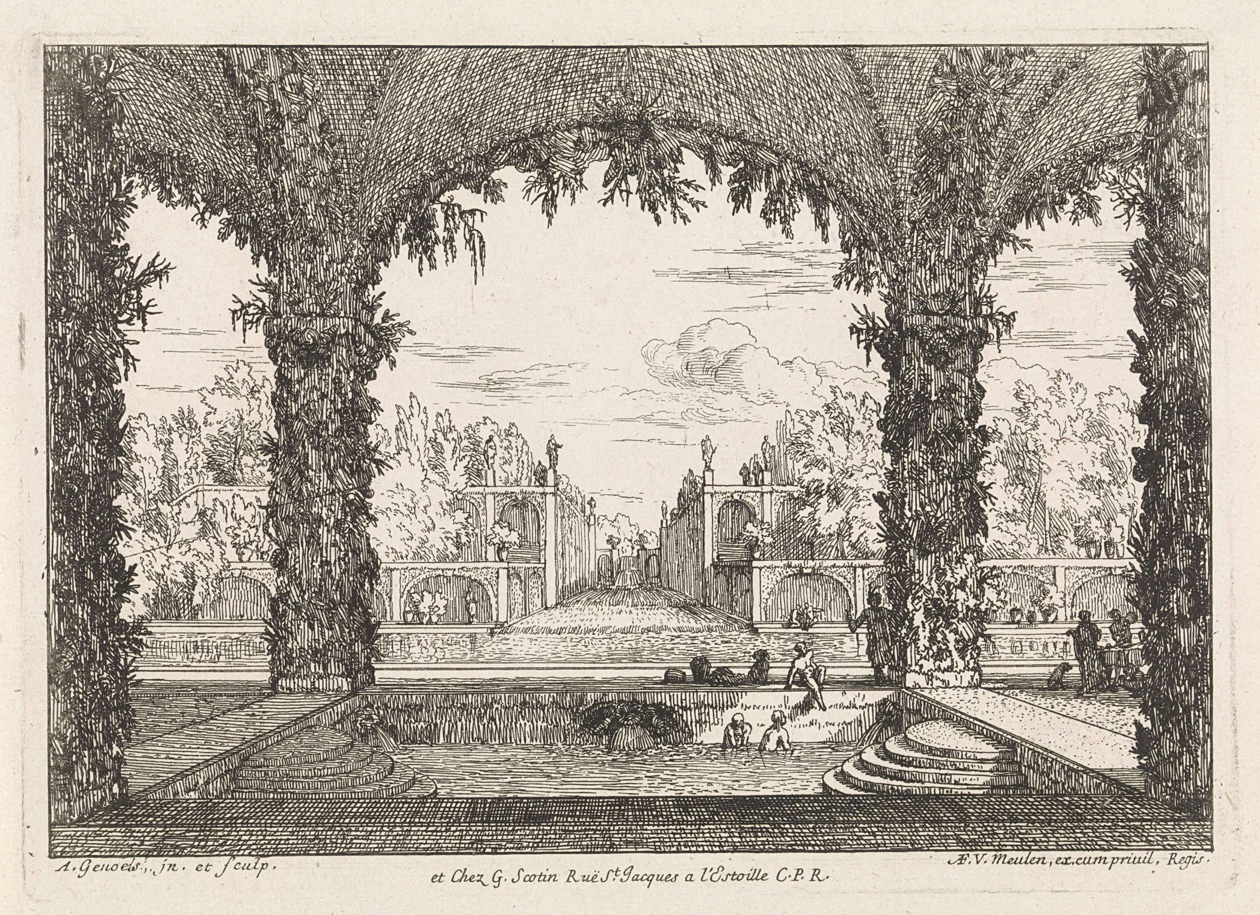 Een openbaar bad in een architectonische tuin. De prent maakt deel uit van een serie met zes tuinlandschappen.