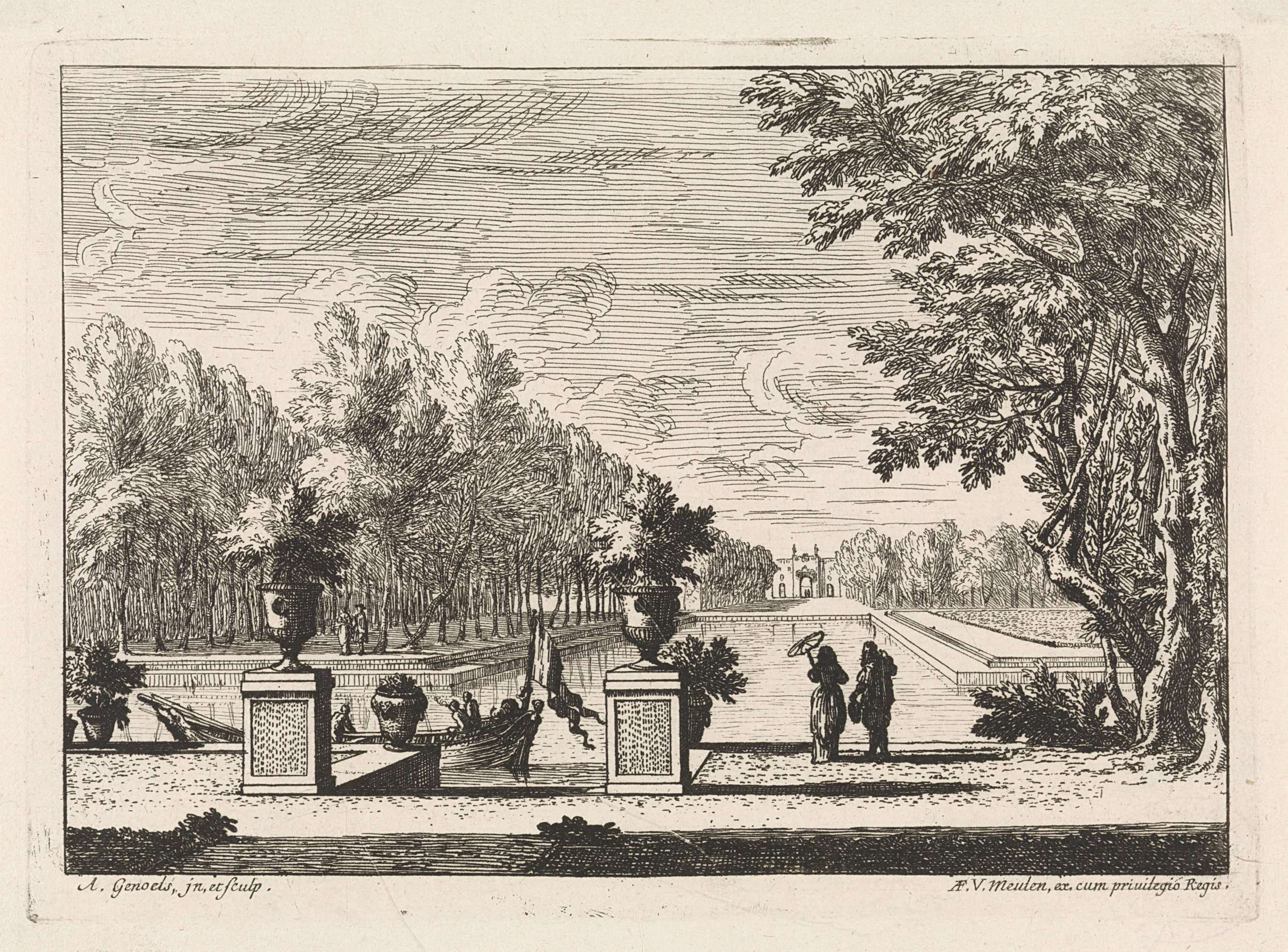 Een Franse tuin met een aangelegd kanaal, waarin een gondel ligt aangemeerd. Op de achtergrond een paleis. De prent maakt deel uit van een serie met zes tuinlandschappen.