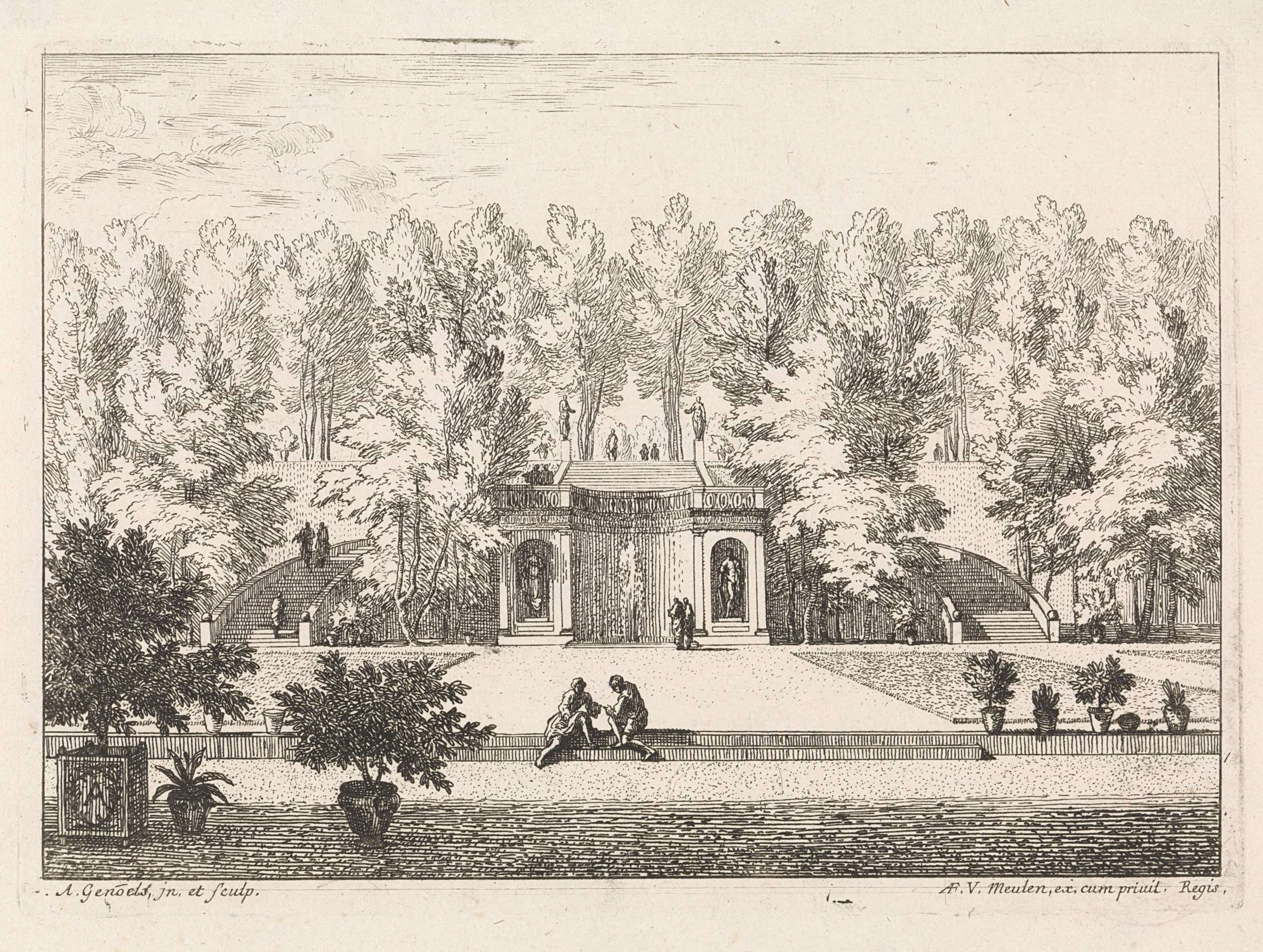 Een terras met beelden en een fontein in een architectonische tuin. De prent maakt deel uit van een serie met zes tuinlandschappen.