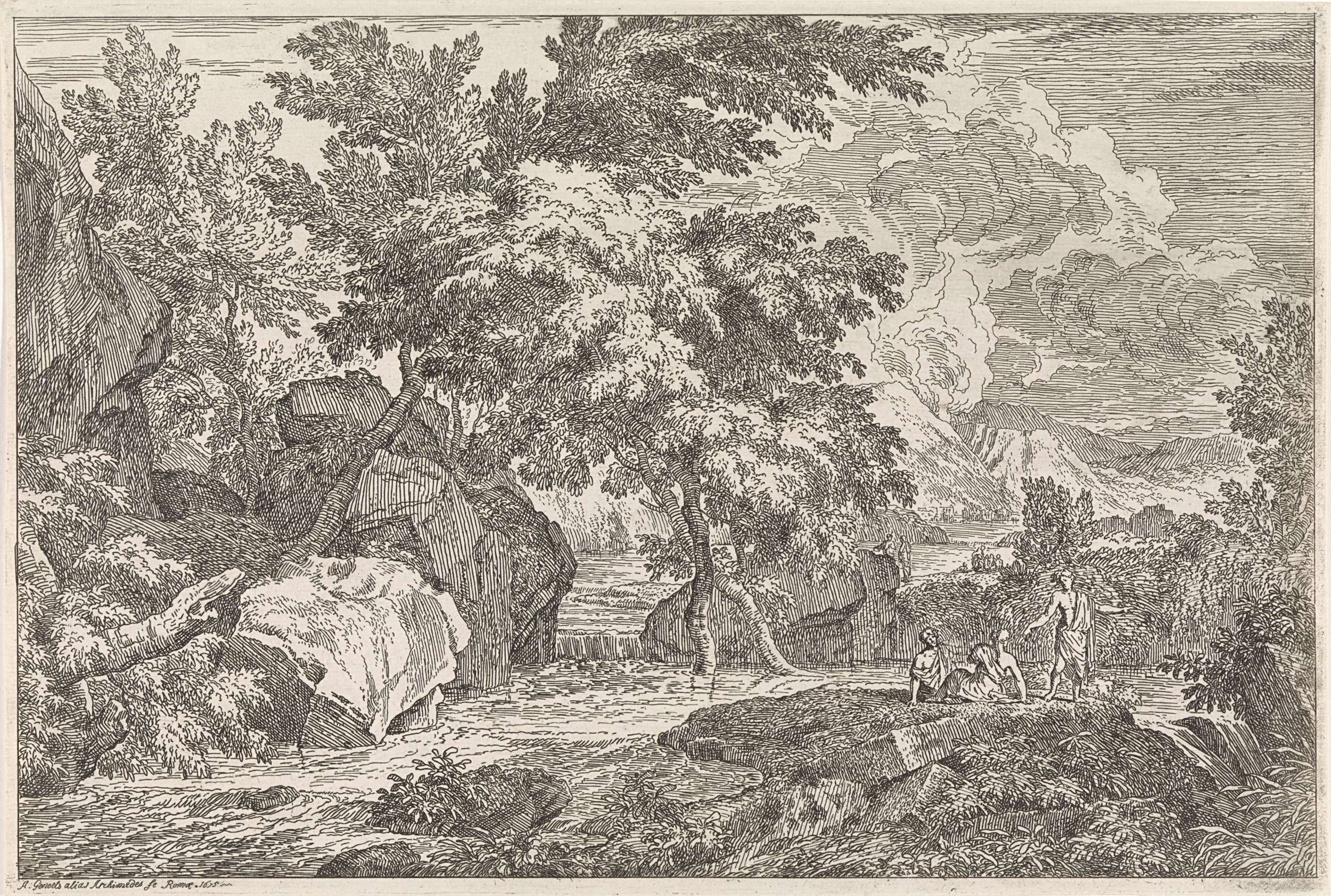 Een arcadisch landschap met bergen en een rivier. Aan de oever van de rivier drie jongelingen in klassieke klederdracht.