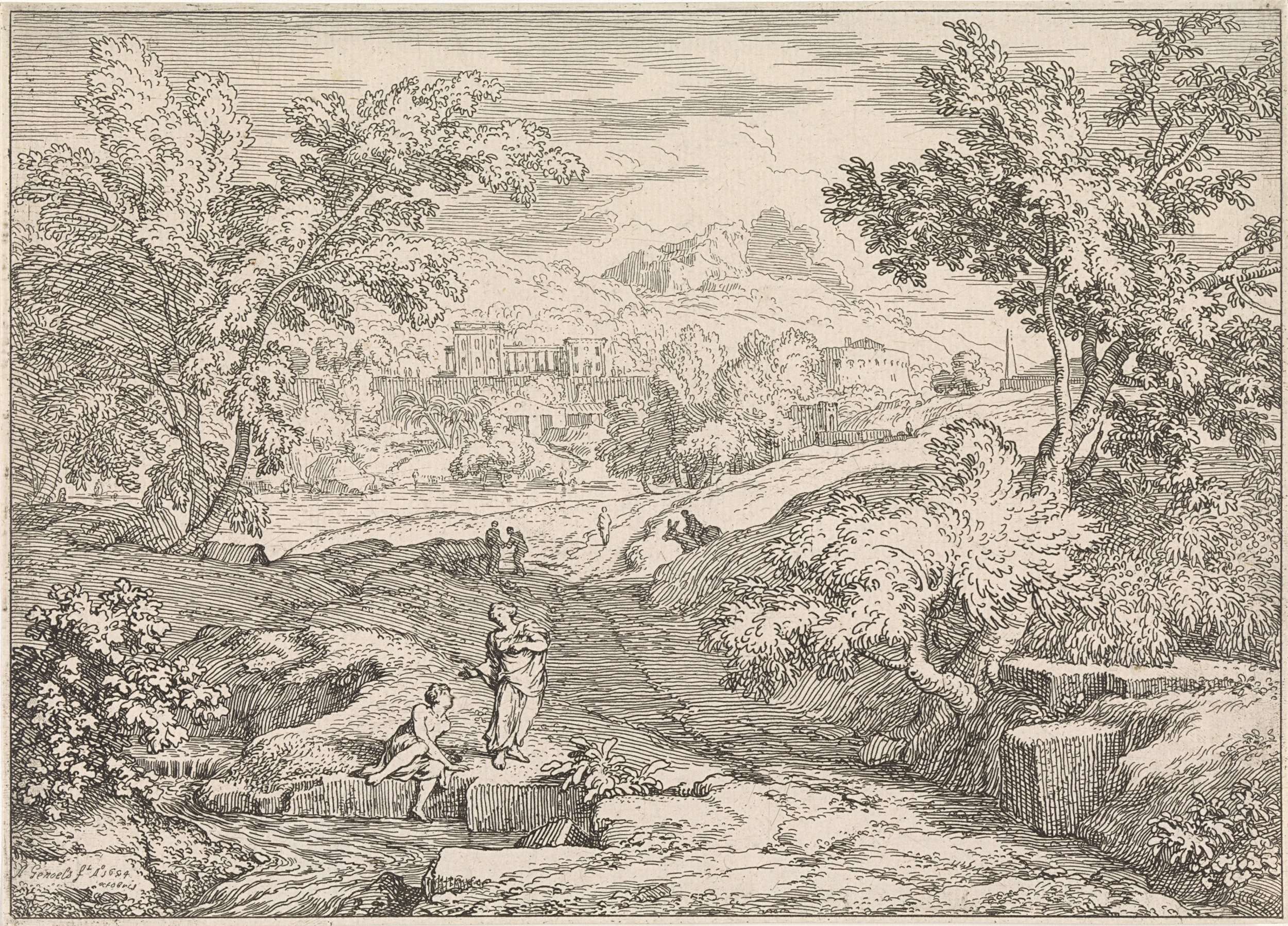 Een arcadisch landschap met heuvels. Op de voorgrond een beekje. Op de achtergrond een stad. De prent is deel van een serie van vier arcadische landschappen.